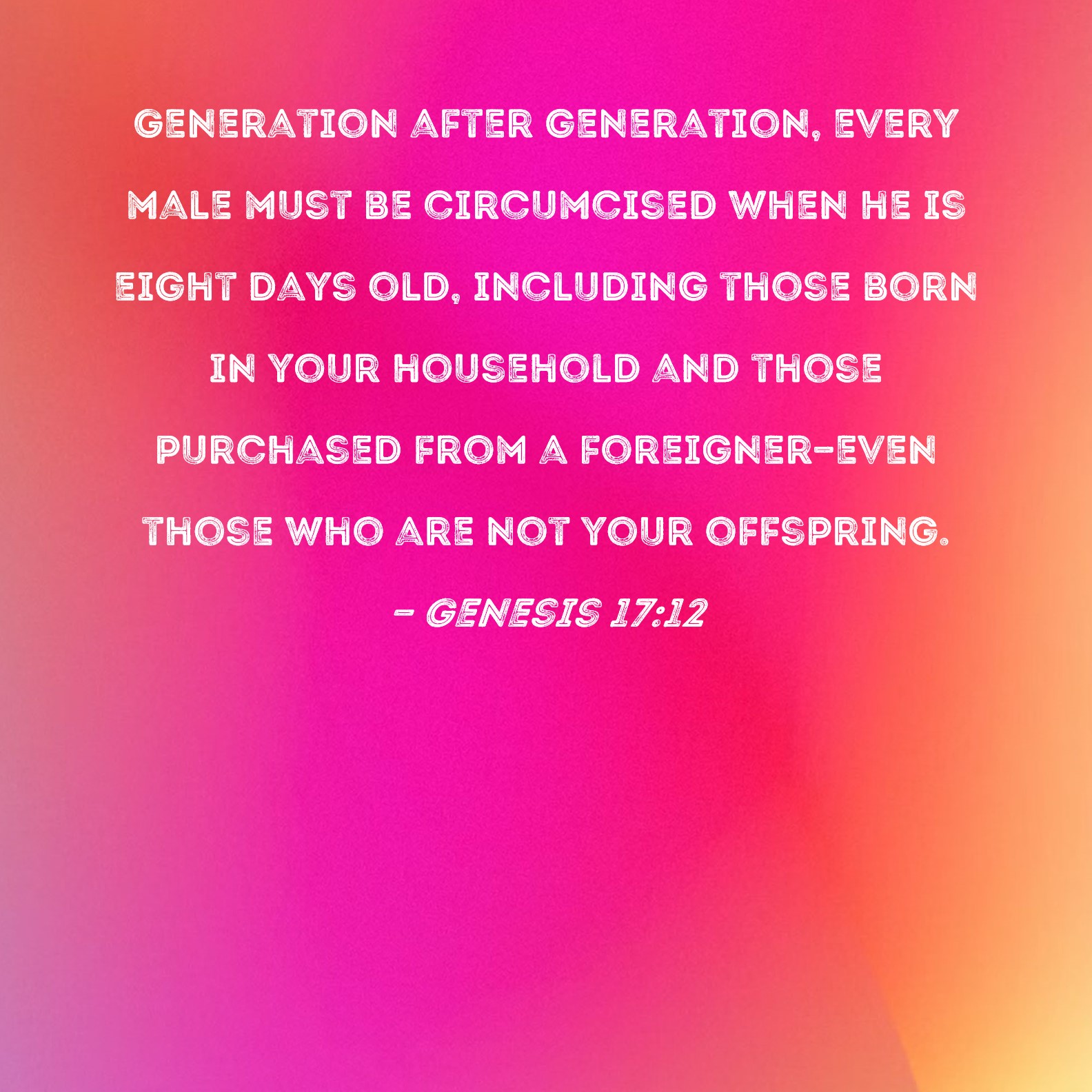Genesis 17:12 Generation after generation, every male must be circumcised when he is eight days old, including those born in your household and those purchased from a foreigner--even those who are not your offspring.