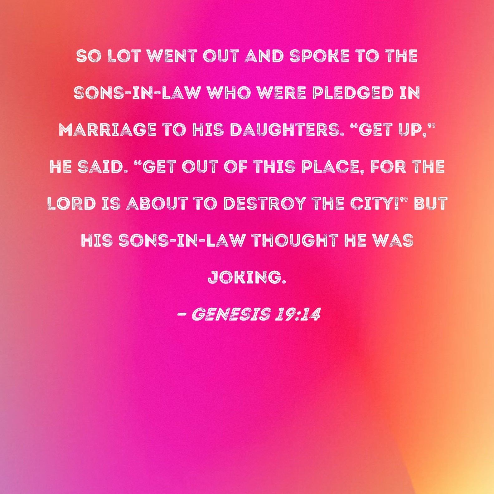 Genesis 19:14 So Lot went out and spoke to the sons-in-law who were pledged in marriage to his daughters. "Get up," he said. "Get out of this place, for the LORD is about to destroy the city!" But his sons-in-law thought he was joking.