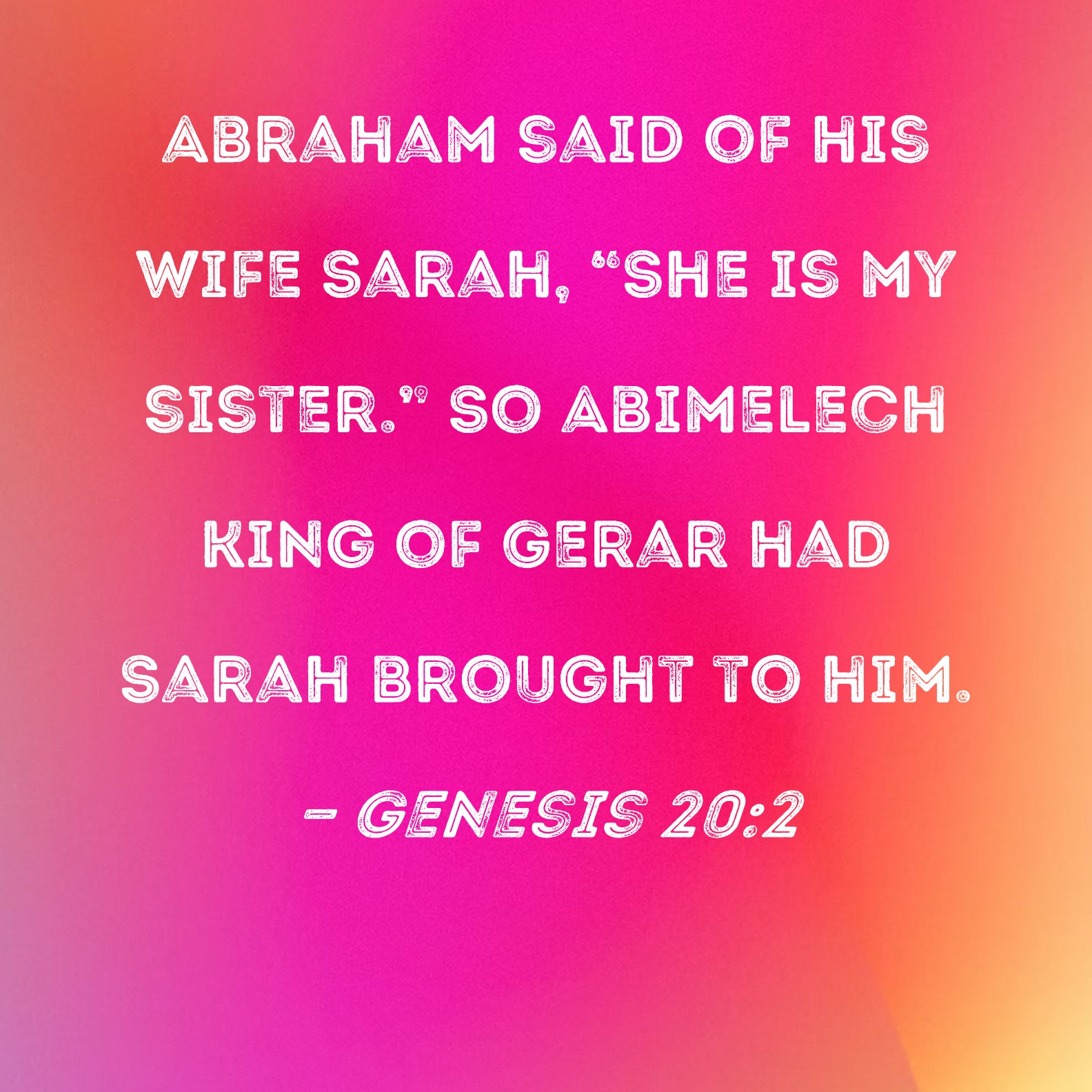 Genesis 20:2 Abraham said of his wife Sarah, "She is my sister." So Abimelech king of Gerar had Sarah brought to him.