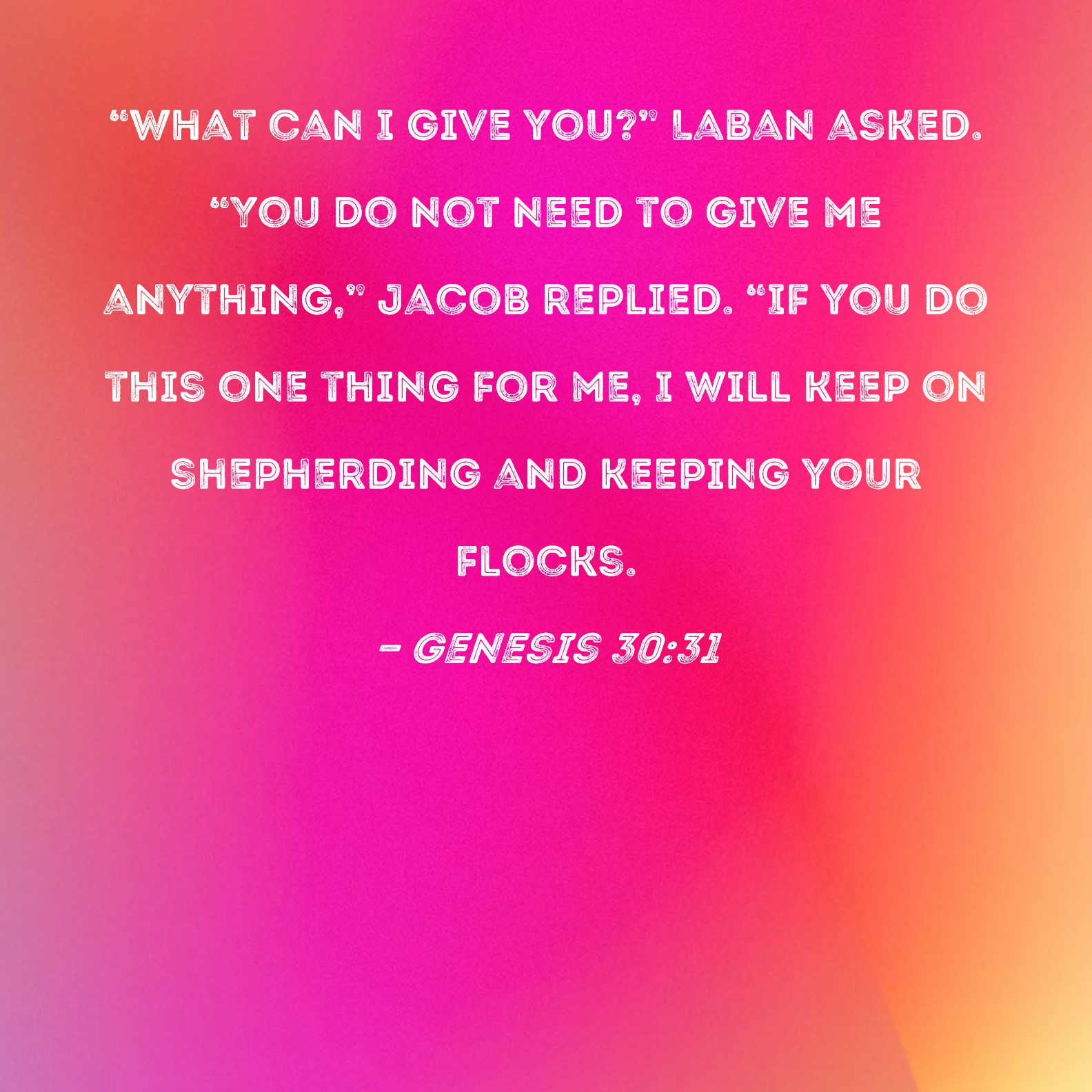 Genesis 30:31 "What can I give you?" Laban asked. "You do not need to give me anything," Jacob replied. "If you do this one thing for me, I will keep on shepherding and keeping your flocks.