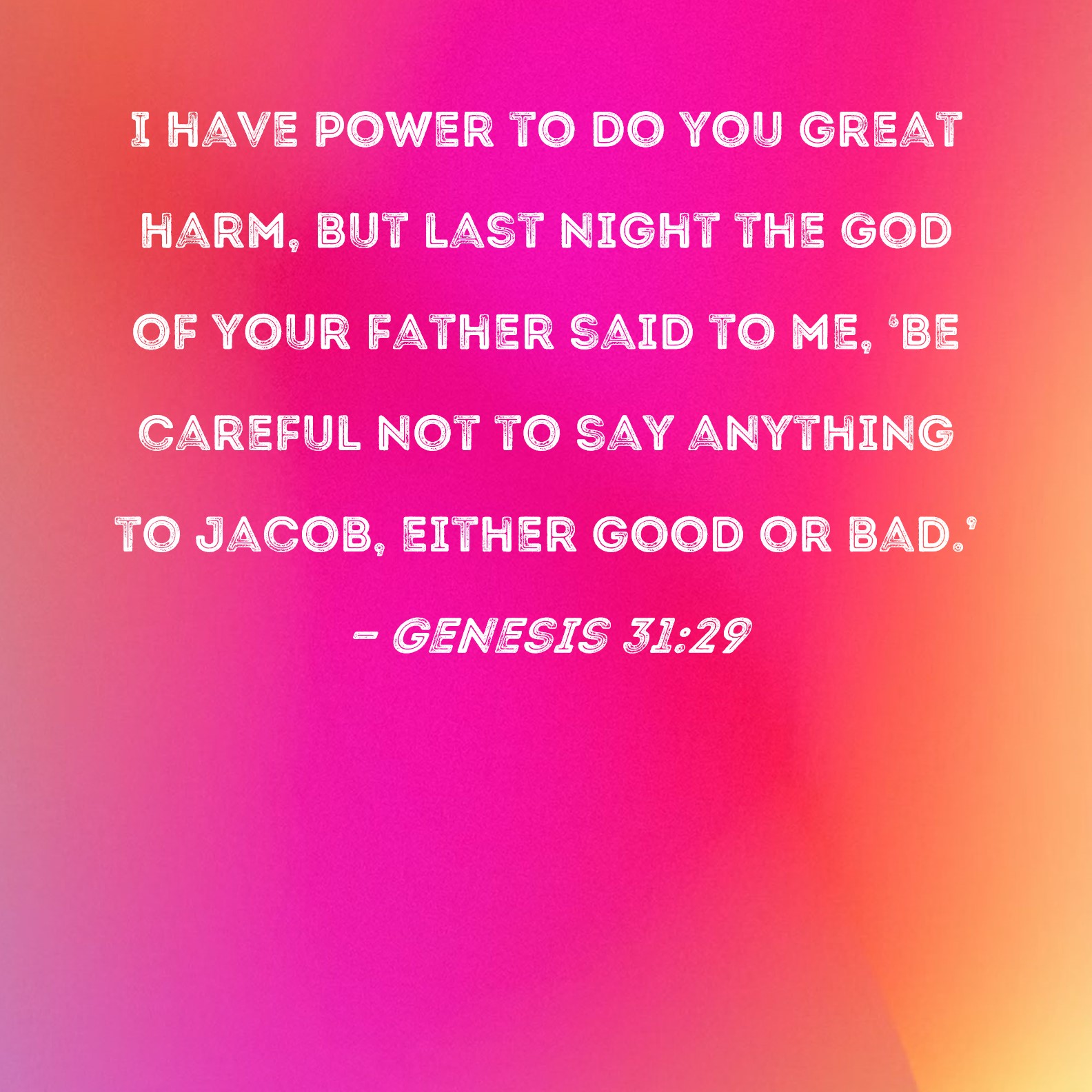 Genesis 31:29 I have power to do you great harm, but last night the God of your father said to me, 'Be careful not to say anything to Jacob, either good or bad.'