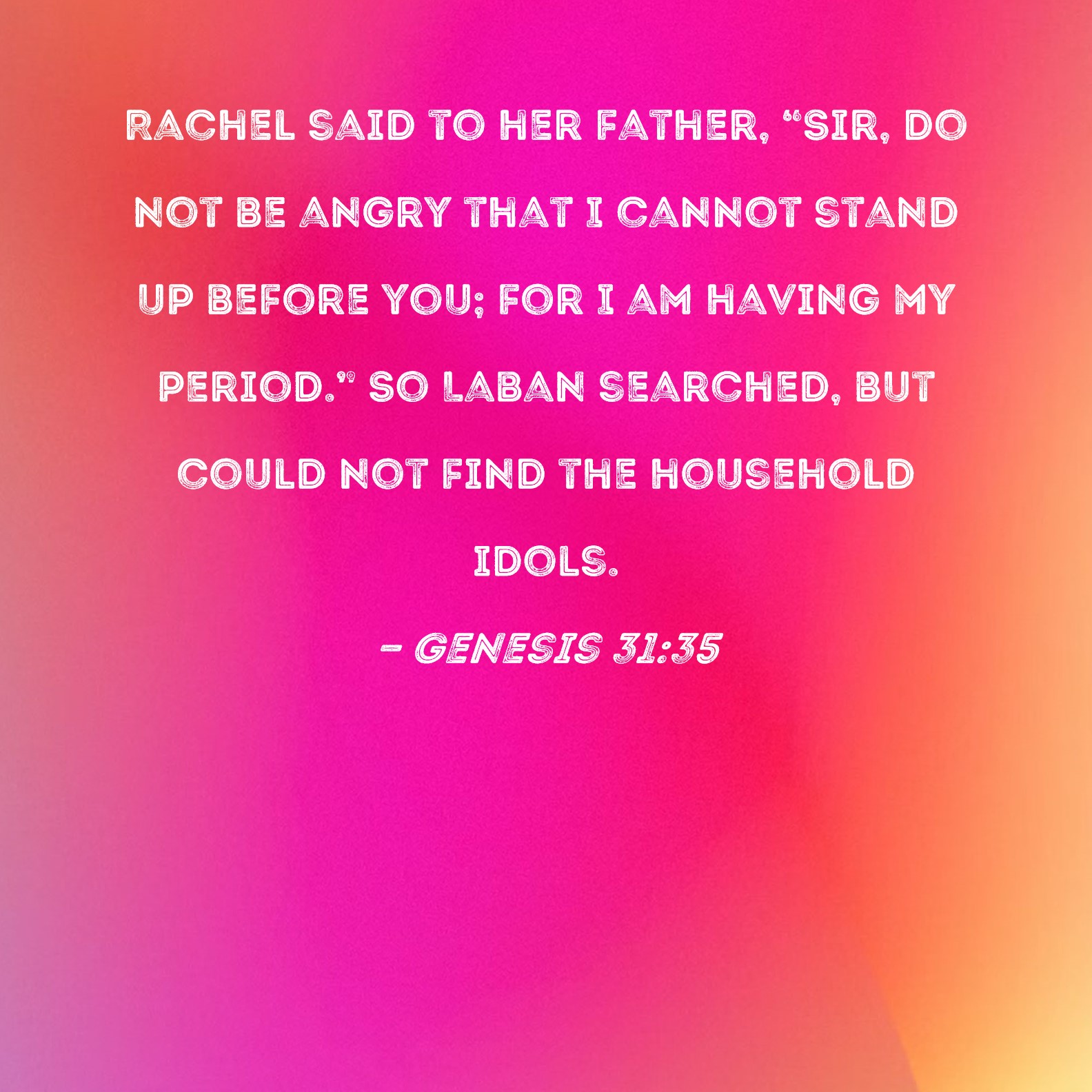 Genesis 31:35 Rachel said to her father, "Sir, do not be angry that I cannot stand up before you; for I am having my period." So Laban searched, but could not find the household idols.