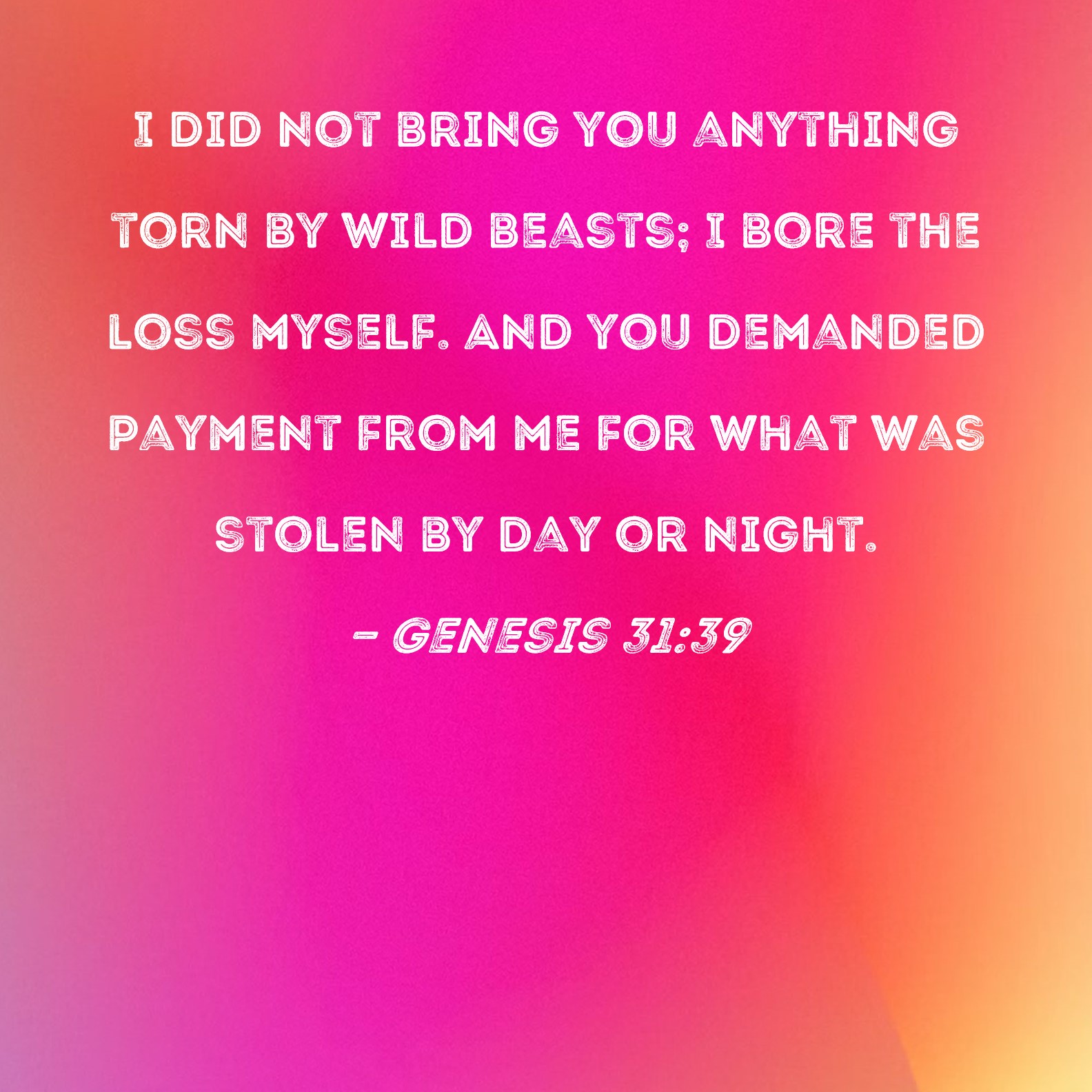 Genesis 31:39 I did not bring you anything torn by wild beasts; I bore the loss myself. And you demanded payment from me for what was stolen by day or night.