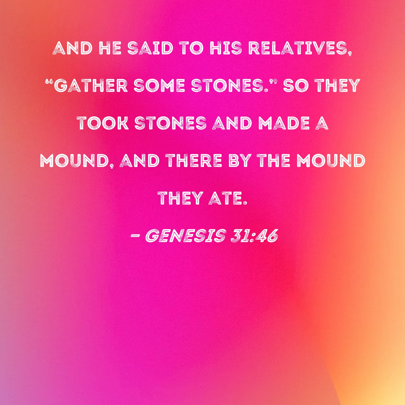 Genesis 31:46 and he said to his relatives, "Gather some stones." So they took stones and made a mound, and there by the mound they ate.