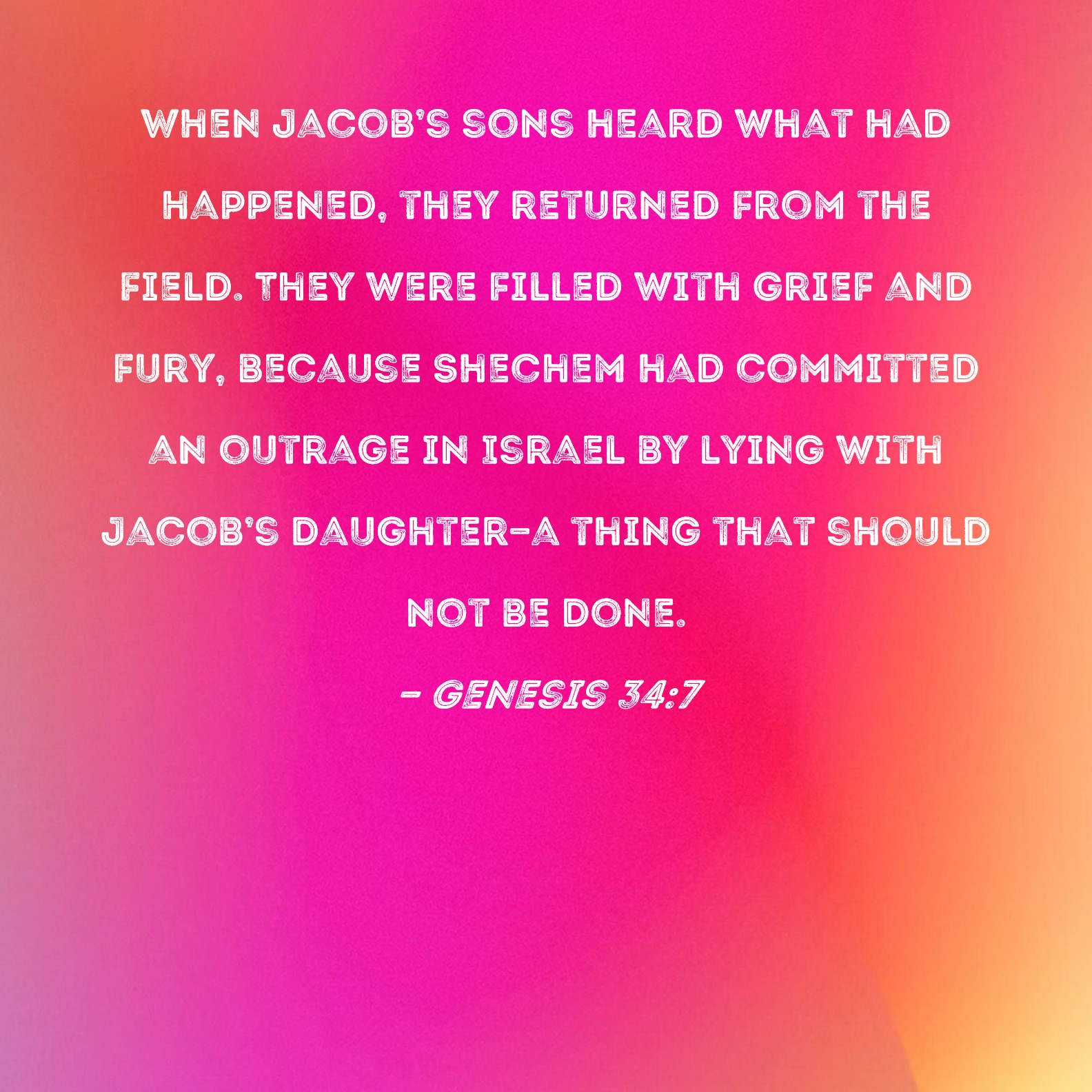 Genesis 34:7 When Jacob's sons heard what had happened, they returned from the field. They were filled with grief and fury, because Shechem had committed an outrage in Israel by lying with Jacob's daughter--a thing that should not be done.