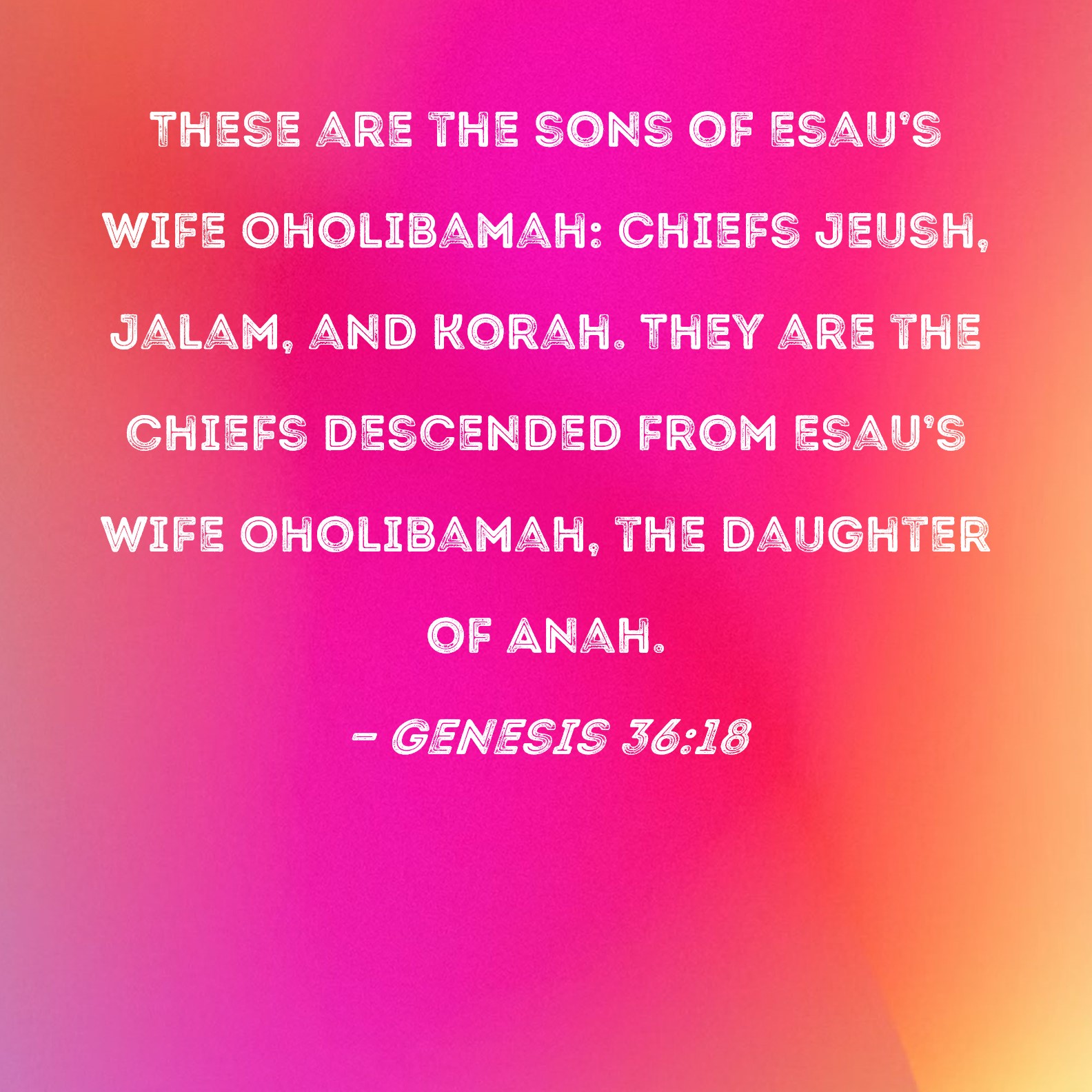Genesis 36:18 These are the sons of Esau's wife Oholibamah: Chiefs Jeush, Jalam, and Korah. They are the chiefs descended from Esau's wife Oholibamah, the daughter of Anah.
