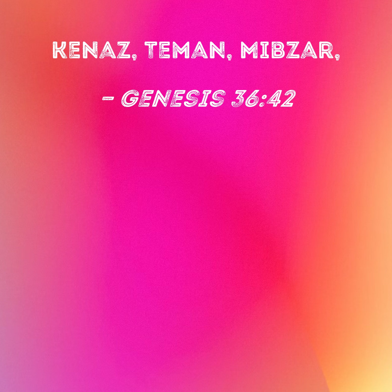 BSB: Kenaz, Teman, Mibzar, KJV: Duke Kenaz, duke Teman, duke Mibzar, DRB: Duke Cenez, duke Theman, duke Mabsar, DBT: chief Kenaz, chief Teman, chief Mibzar, ERV: duke Kenaz, duke Teman, duke Mibzar; WBT: Duke Kenaz, duke Teman, duke Mibzar. WEB: chief Kenaz, chief Teman, chief Mibzar, YLT: chief Kenaz, chief Teman, chief Mibzar,Links Genesis 36:42 NIV • Genesis 36:42 NLT • Genesis 36:42 ESV • Genesis 36:42 NASB • Genesis 36:42 KJV • Genesis 36:42 Interlinear • Genesis 36:42 Commentaries • Genesis 36:42 Parallel Texts • Genesis 36:42 Bible Apps • Genesis 36:42 Parallel • Bible Hub |