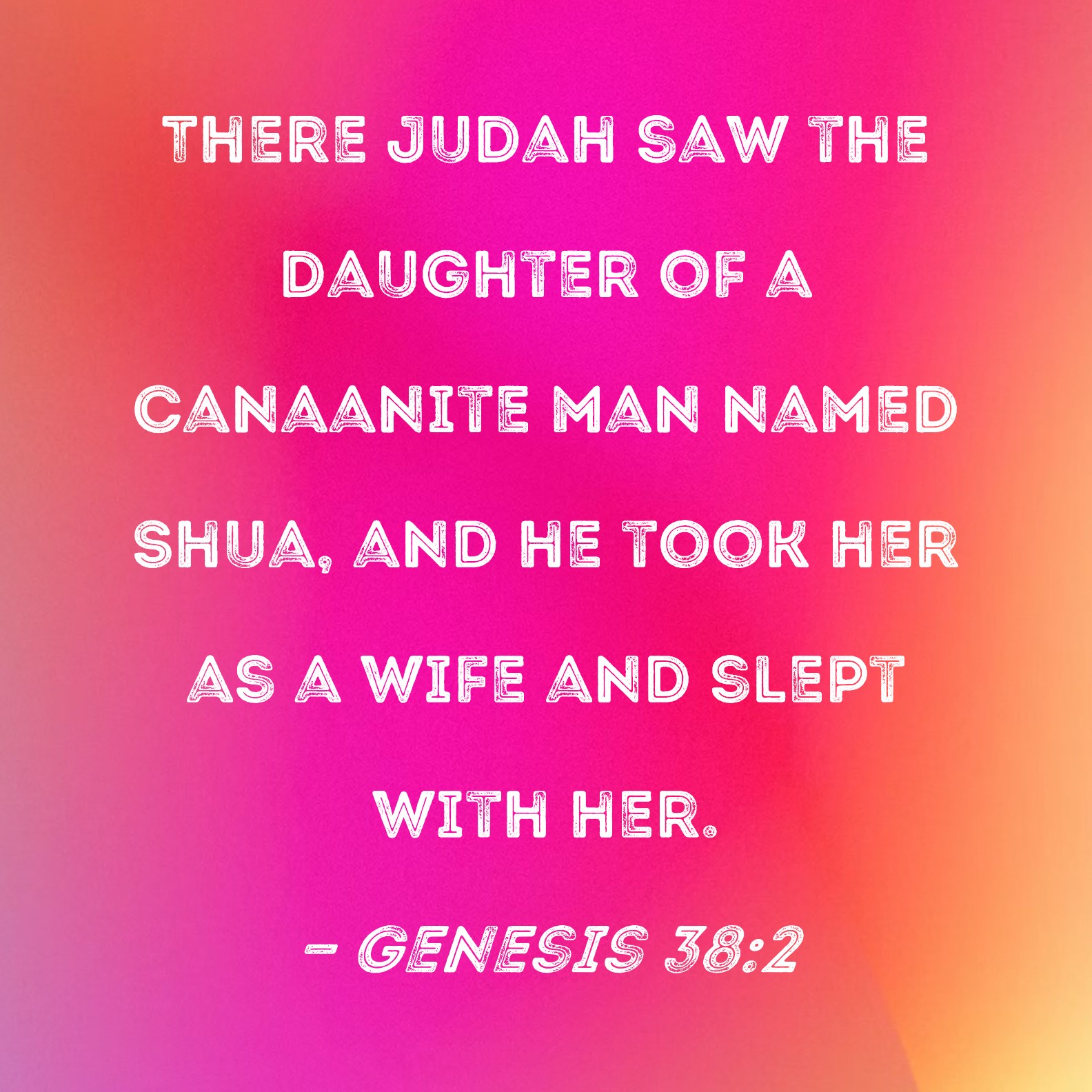 Genesis 38:2 There Judah saw the daughter of a Canaanite man named Shua, and he took her as a wife and slept with her.