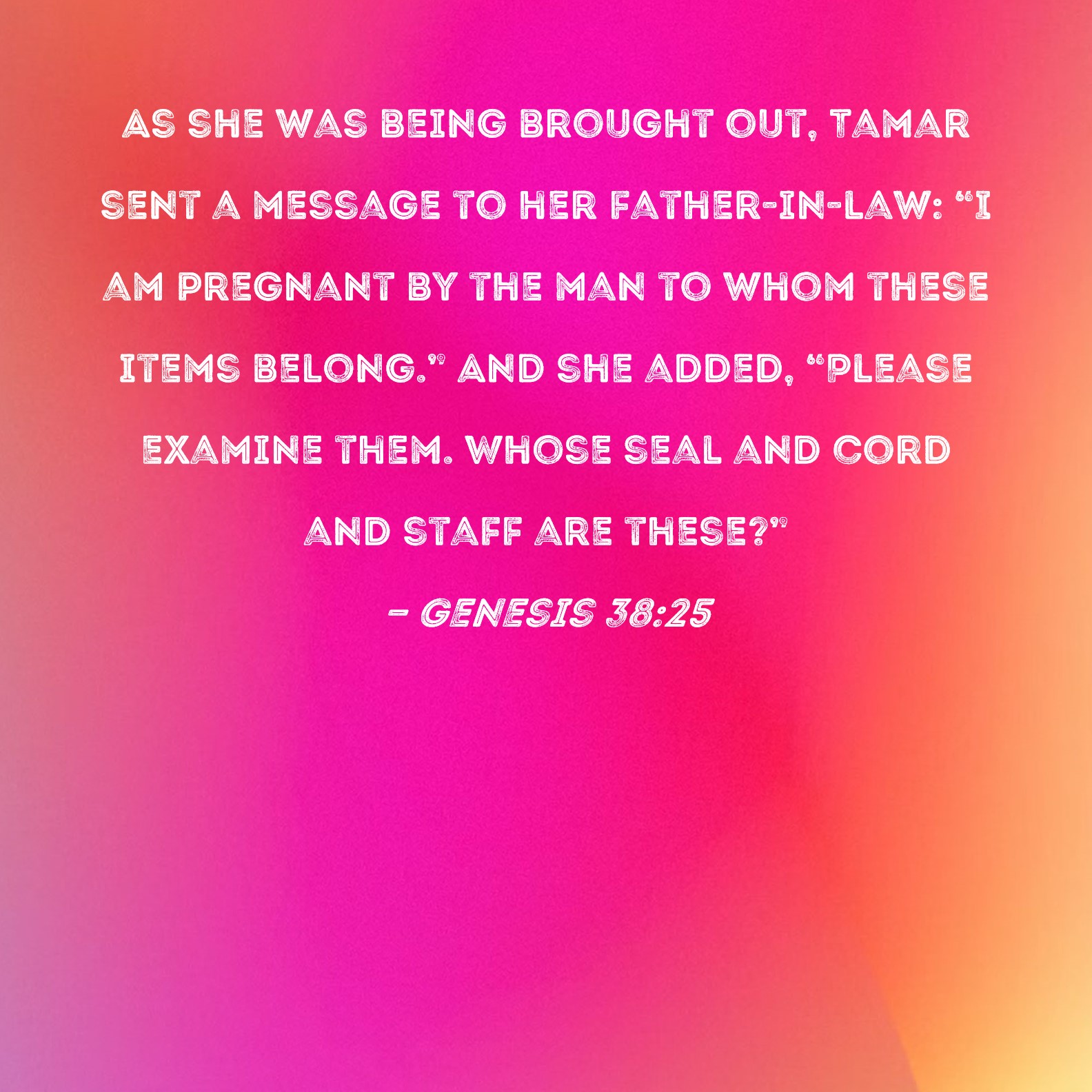 Genesis 38:25 As she was being brought out, Tamar sent a message to her father-in-law: "I am pregnant by the man to whom these items belong." And she added, "Please examine them. Whose seal and cord and staff are these?"