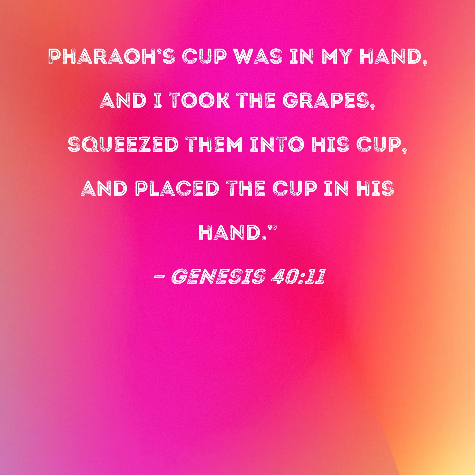 Genesis 40:11 Pharaoh's cup was in my hand, and I took the grapes, squeezed them into his cup, and placed the cup in his hand."