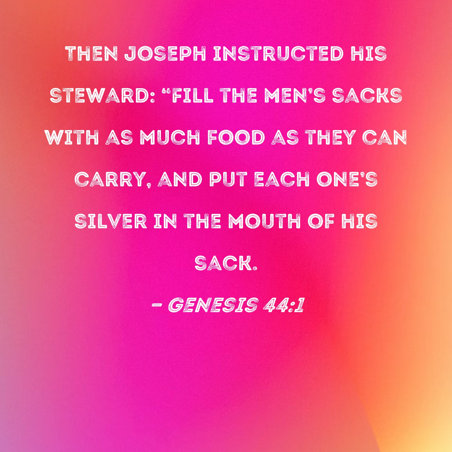 Genesis 44:1 Then Joseph instructed his steward: "Fill the men's sacks with as much food as they can carry, and put each one's silver in the mouth of his sack.