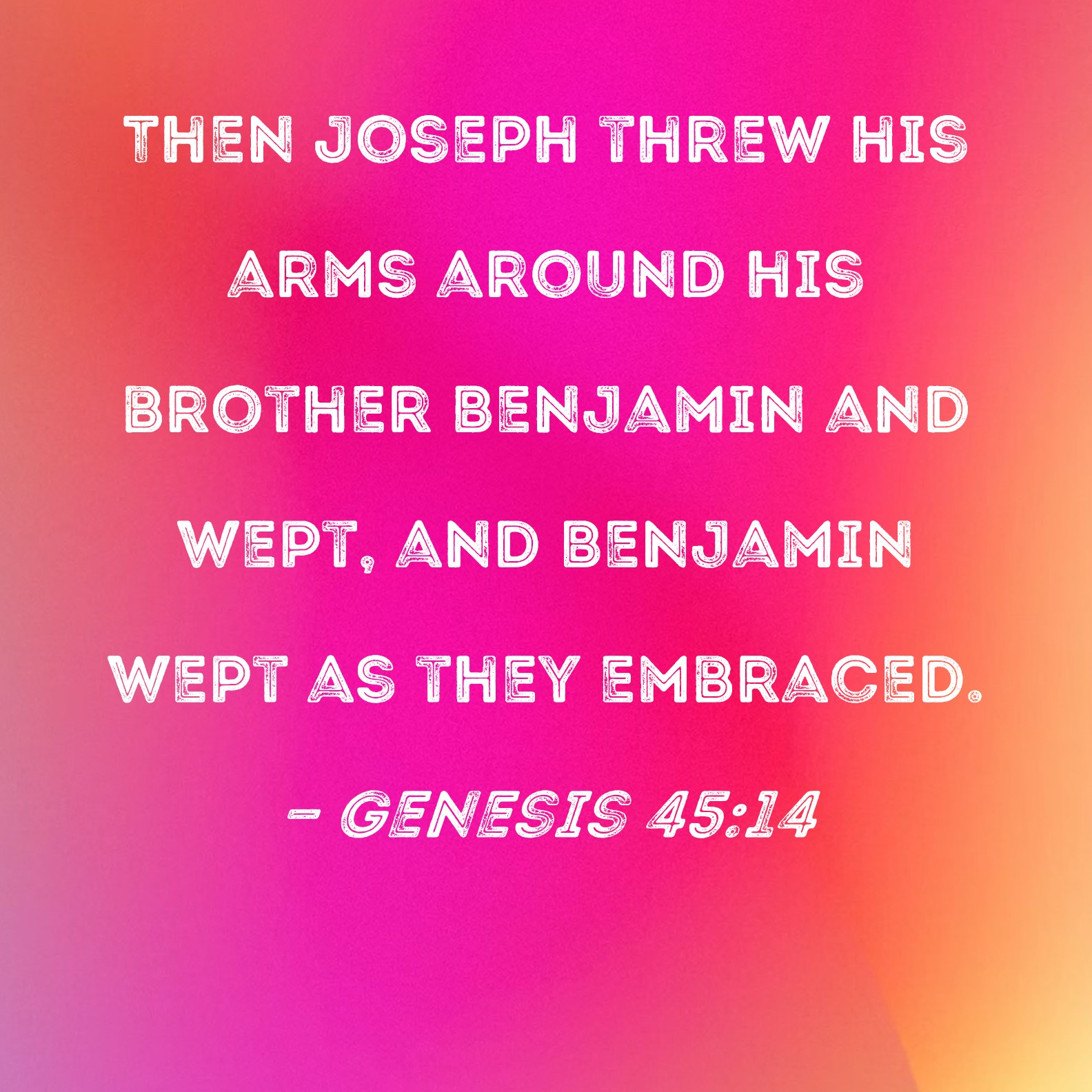 Genesis 45:14 Then Joseph threw his arms around his brother Benjamin and wept, and Benjamin wept as they embraced.