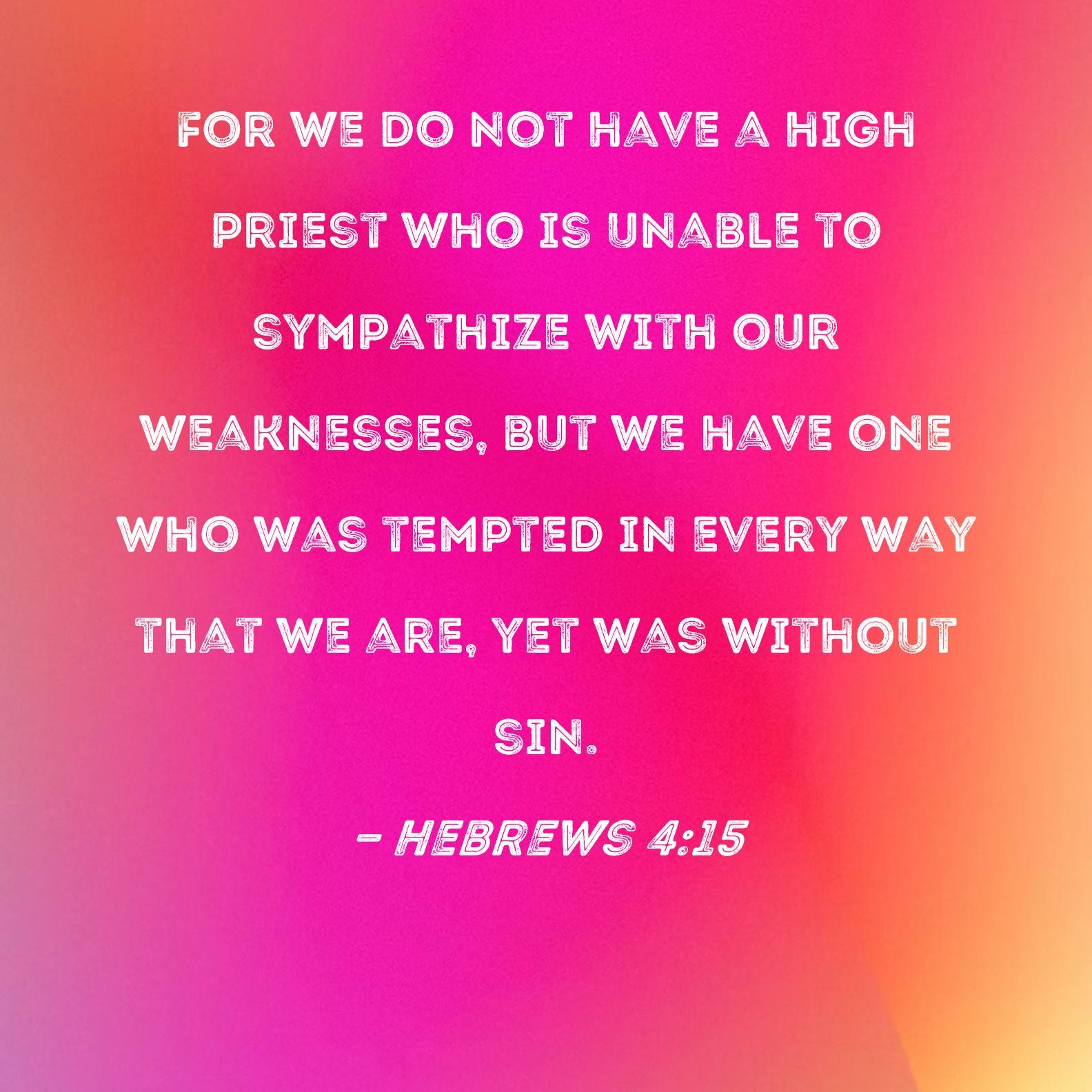 BSB: For we do not have a high priest who is unable to sympathize with our weaknesses, but we have one who was tempted in every way that we are, yet was without sin. KJV: For we have not an high priest which cannot be touched with the feeling of our infirmities; but was in all points tempted like as we are, yet without sin. DRB: For we have not a high priest, who can not have compassion on our infirmities: but one tempted in all things like as we are, without sin. DBT: For we have not a high priest not able to sympathise with our infirmities, but tempted in all things in like manner, sin apart. ERV: For we have not a high priest that cannot be touched with the feeling of our infirmities; but one that hath been in all points tempted like as we are, yet without sin. WBT: For we have not a high priest who cannot be touched with the feeling of our infirmities; but who was in all points tempted as we are, yet without sin. WEB: For we don’t have a high priest who can’t be touched with the feeling of our infirmities, but one who has been in all points tempted like we are, yet without sin. YLT: for we have not a chief priest unable to sympathise with our infirmities, but one tempted in all things in like manner — apart from sin;Links Hebrews 4:15 NIV • Hebrews 4:15 NLT • Hebrews 4:15 ESV • Hebrews 4:15 NASB • Hebrews 4:15 KJV • Hebrews 4:15 Interlinear • Hebrews 4:15 Commentaries • Hebrews 4:15 Parallel Texts • Hebrews 4:15 Bible Apps • Hebrews 4:15 Parallel • Bible Hub |