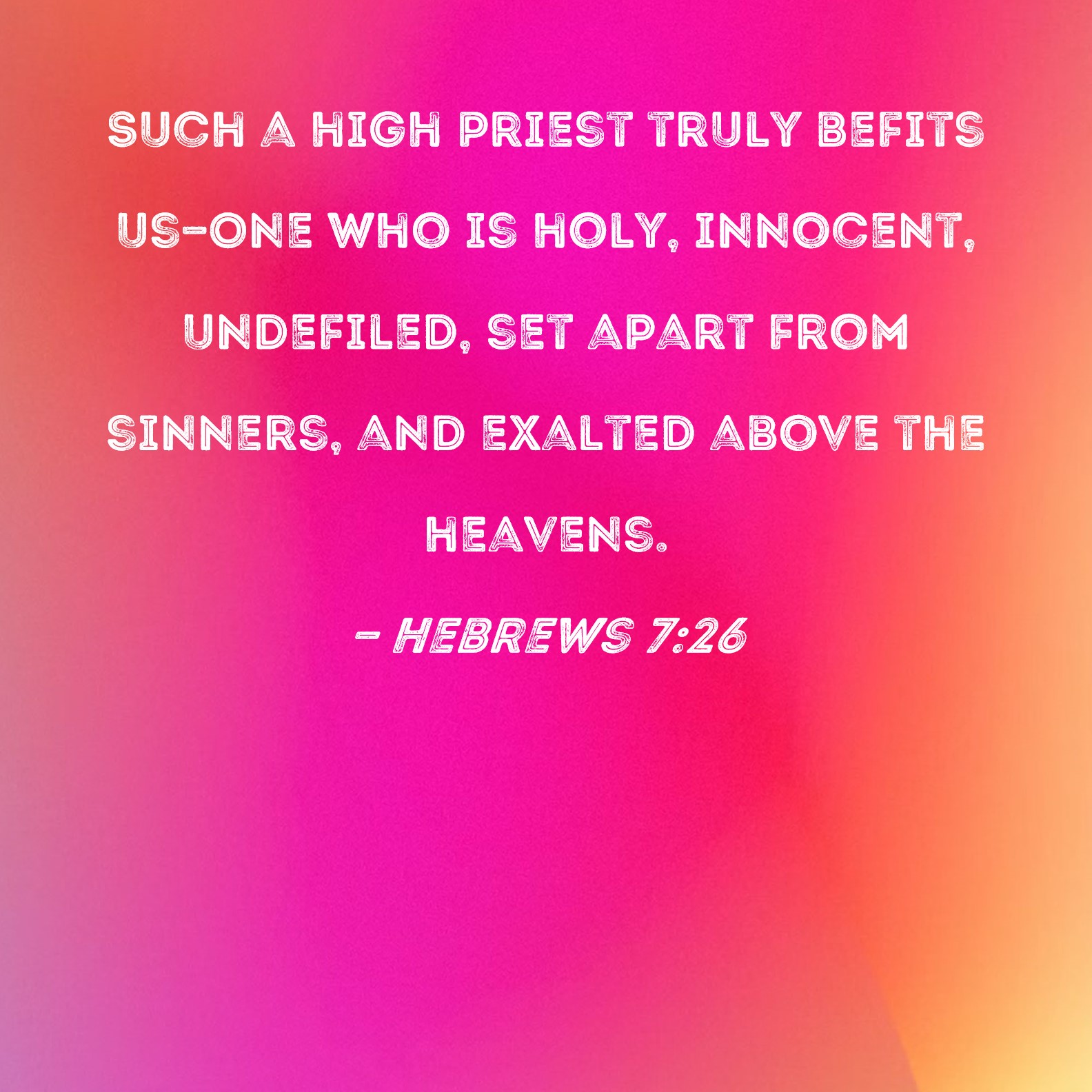 Hebrews 7:26 Such a high priest truly befits us--One who is holy, innocent, undefiled, set apart from sinners, and exalted above the heavens.