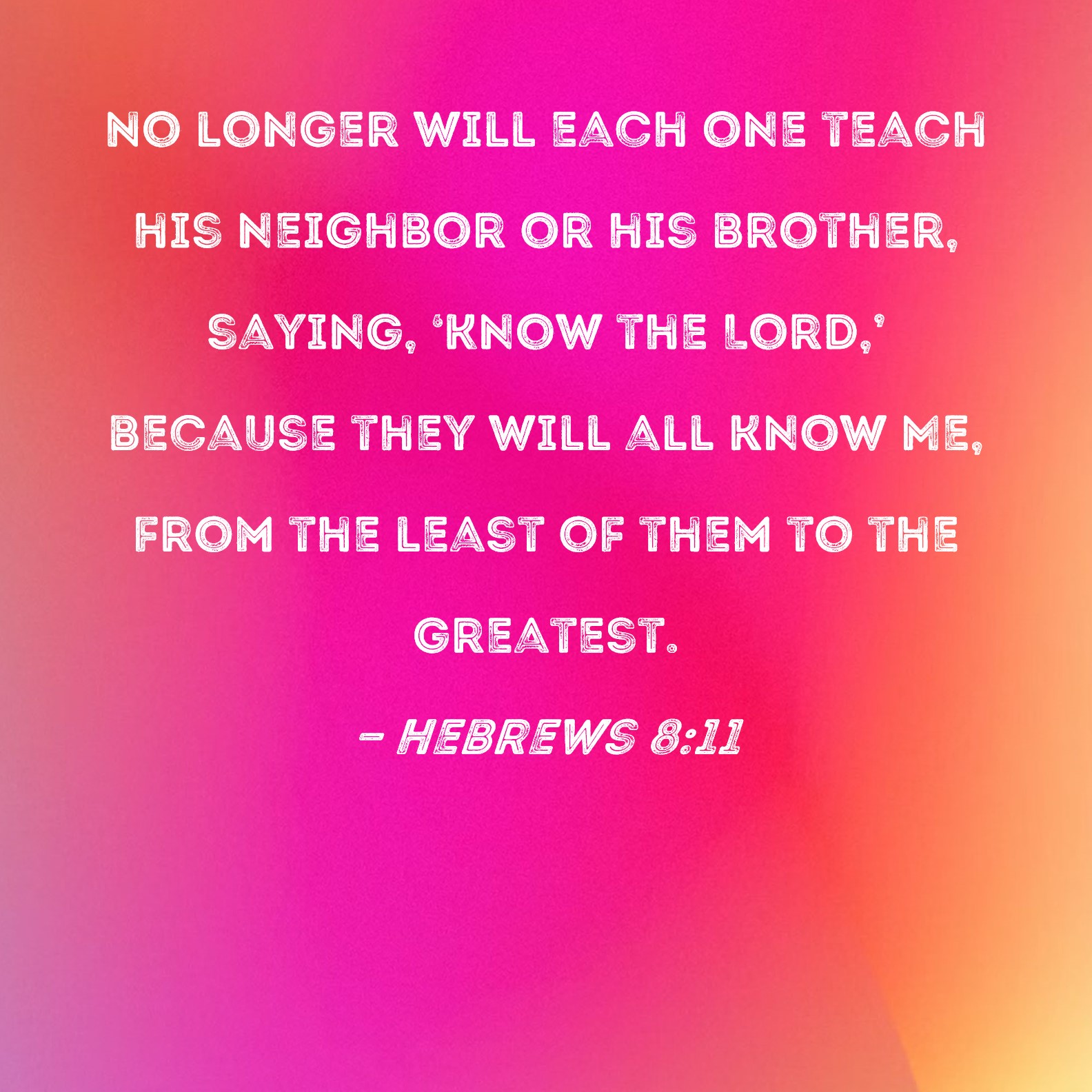 Hebrews 8:11 No longer will each one teach his neighbor or his brother, saying, 'Know the Lord,' because they will all know Me, from the least of them to the greatest.