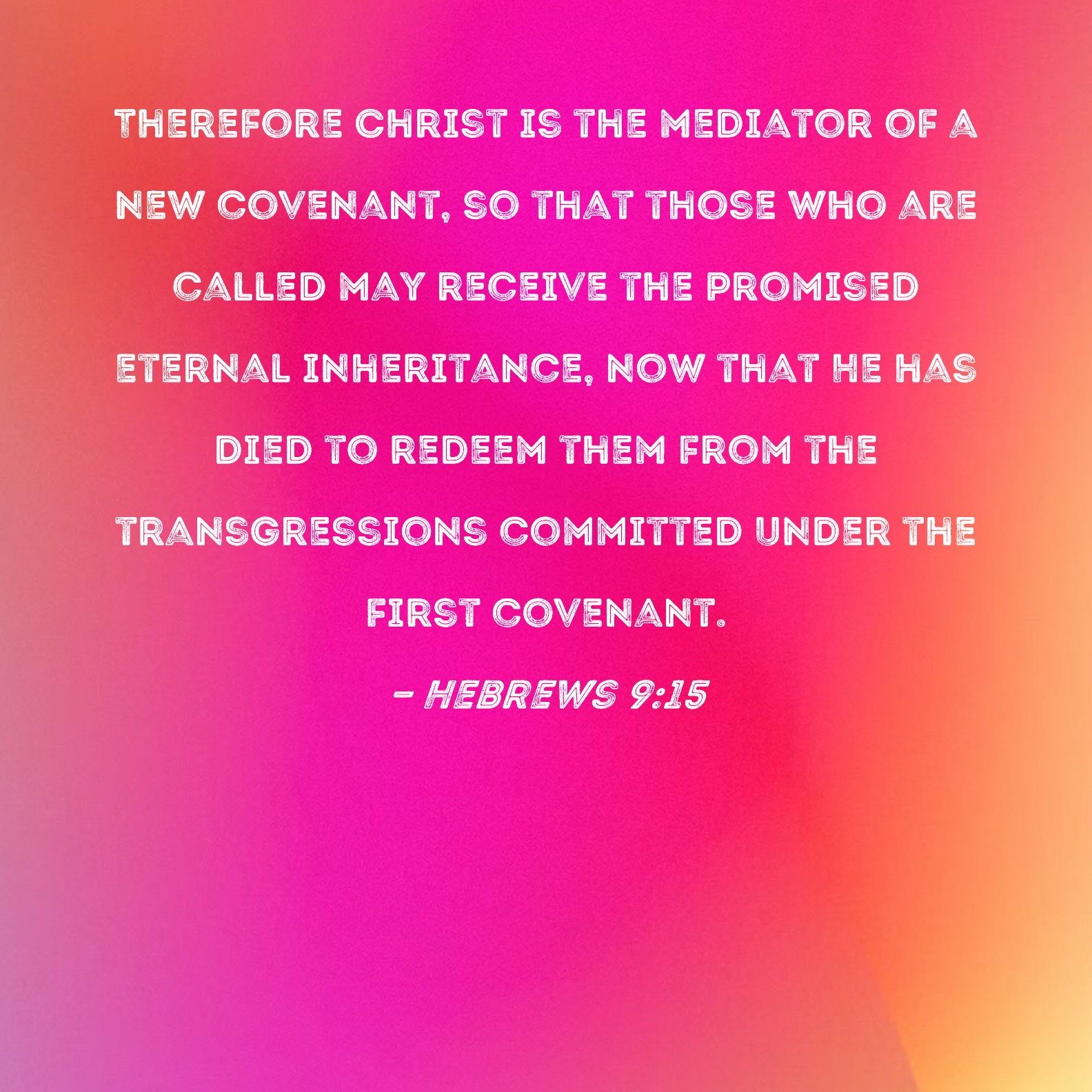 Hebrews 9:15 Therefore Christ is the mediator of a new covenant, so that those who are called may receive the promised eternal inheritance, now that He has died to redeem them from the transgressions committed under the first covenant.