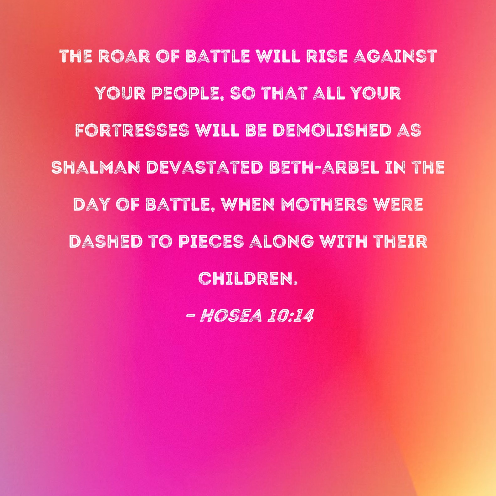 Hosea 10:14 the roar of battle will rise against your people, so that all your fortresses will be demolished as Shalman devastated Beth-arbel in the day of battle, when mothers were dashed to pieces along with their children.