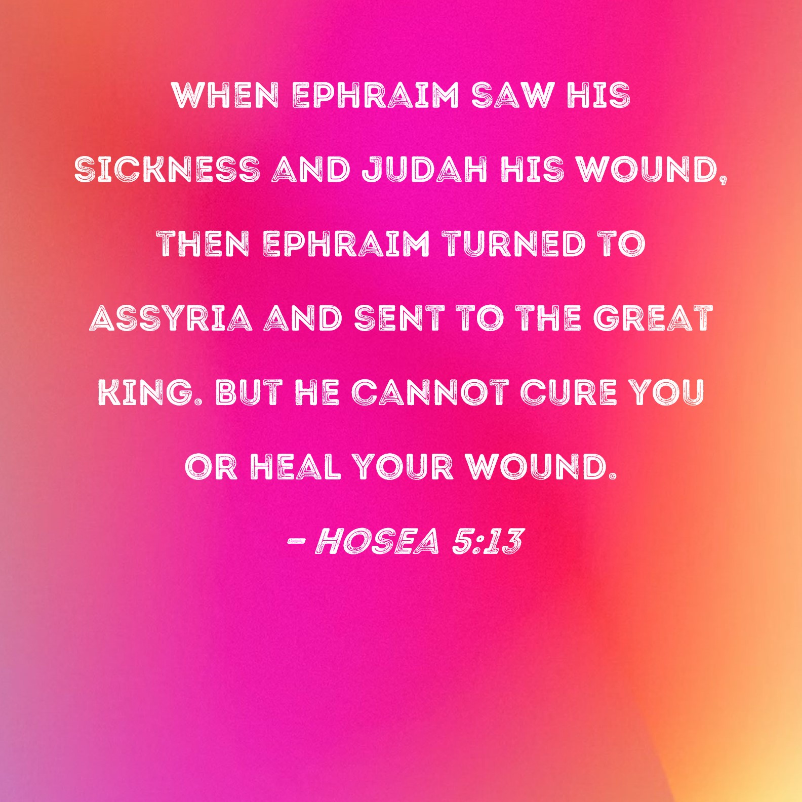 Hosea 5:13 When Ephraim saw his sickness and Judah his wound, then Ephraim turned to Assyria and sent to the great king. But he cannot cure you or heal your wound.
