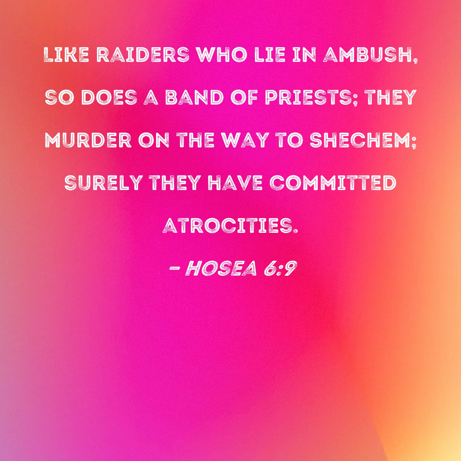Hosea 6:9 Like raiders who lie in ambush, so does a band of priests; they murder on the way to Shechem; surely they have committed atrocities.