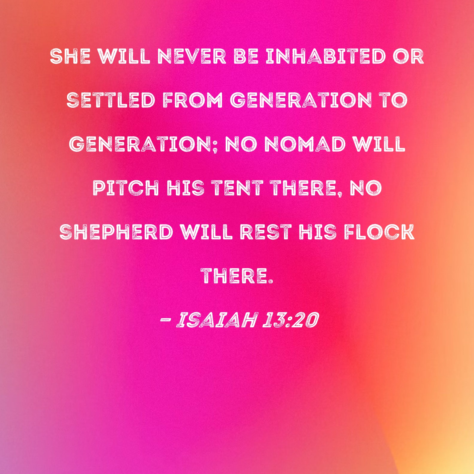 Isaiah 13:20 She will never be inhabited or settled from generation to generation; no nomad will pitch his tent there, no shepherd will rest his flock there.