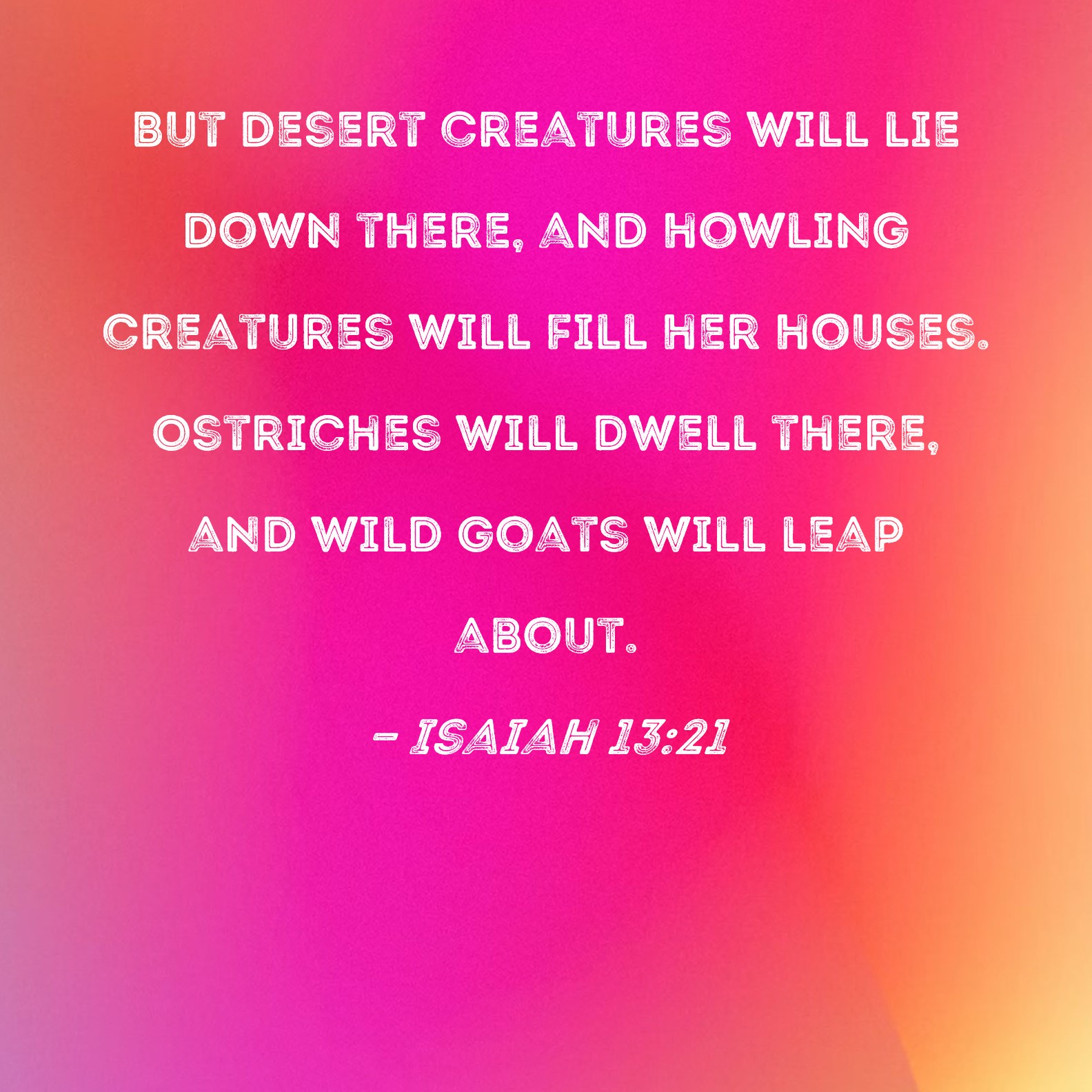 Isaiah 13:21 But desert creatures will lie down there, and howling creatures will fill her houses. Ostriches will dwell there, and wild goats will leap about.