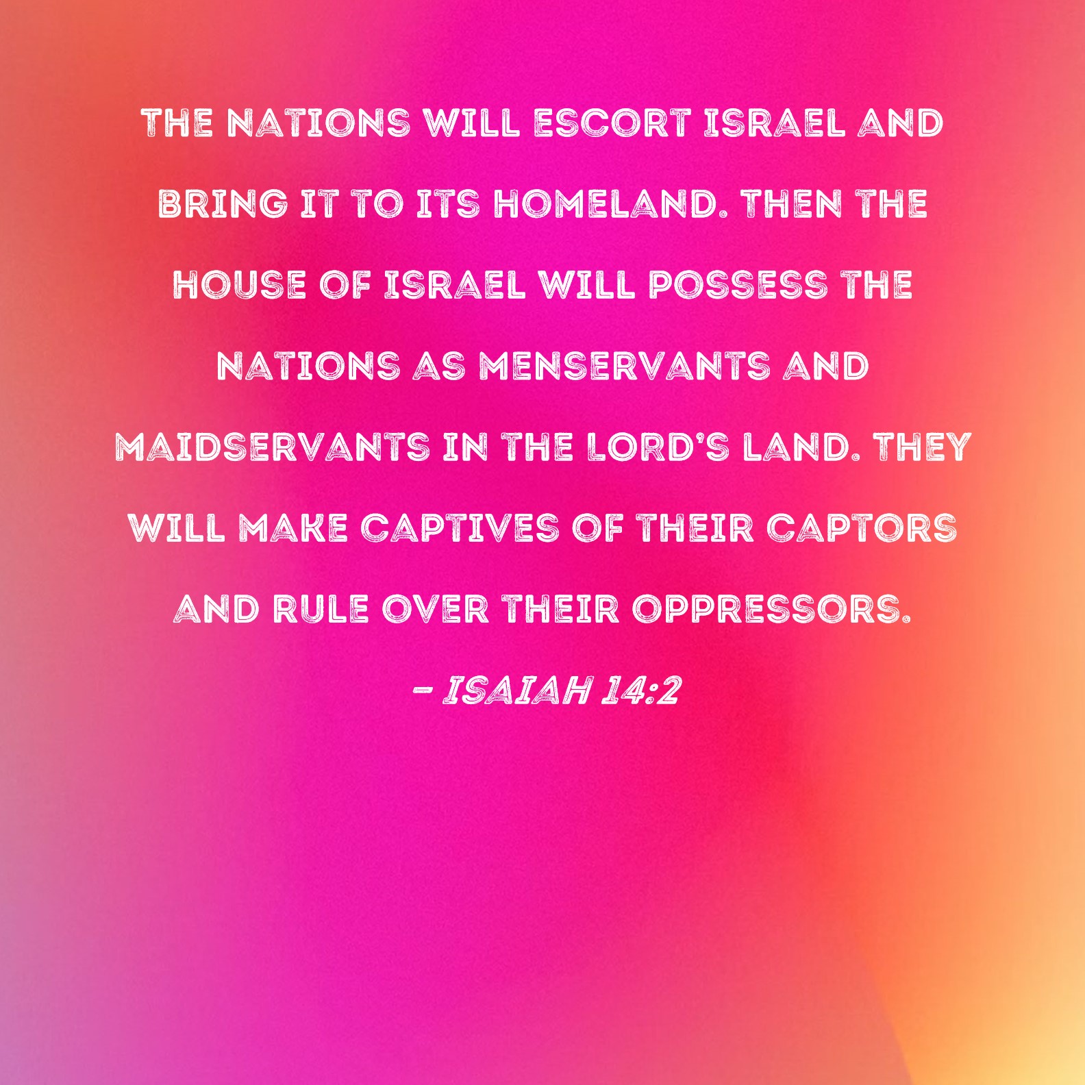 Isaiah 14:2 The nations will escort Israel and bring it to its homeland. Then the house of Israel will possess the nations as menservants and maidservants in the LORD's land. They will make captives of their captors and rule over their oppressors.