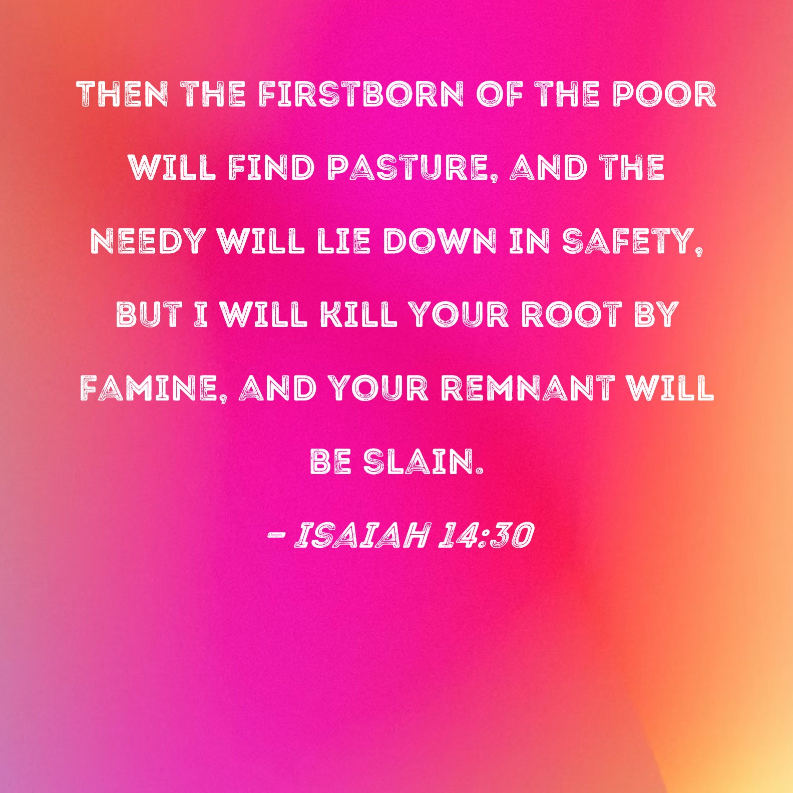 Isaiah 14:30 Then the firstborn of the poor will find pasture, and the needy will lie down in safety, but I will kill your root by famine, and your remnant will be slain.
