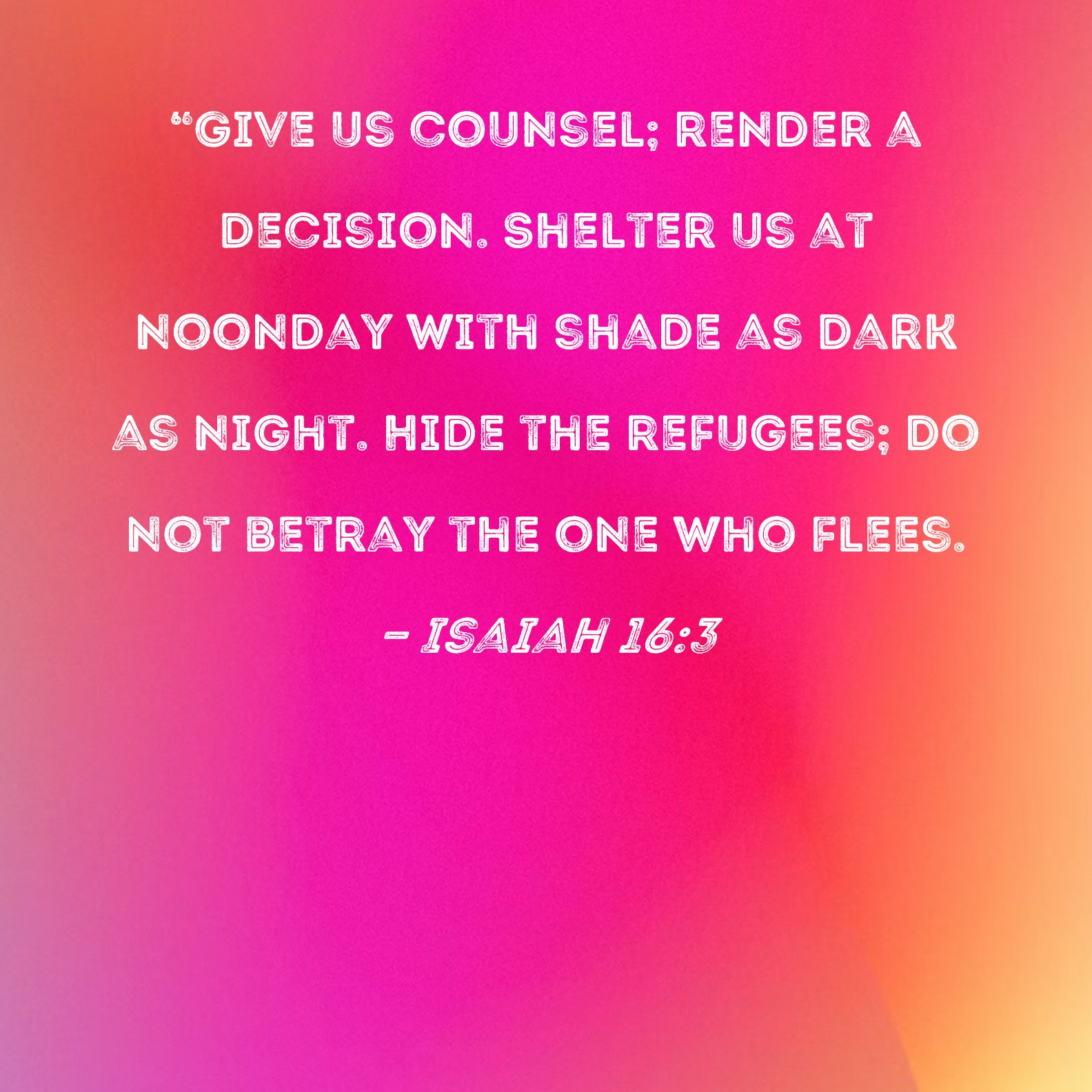 Isaiah 16:3 "Give us counsel; render a decision. Shelter us at noonday with shade as dark as night. Hide the refugees; do not betray the one who flees.
