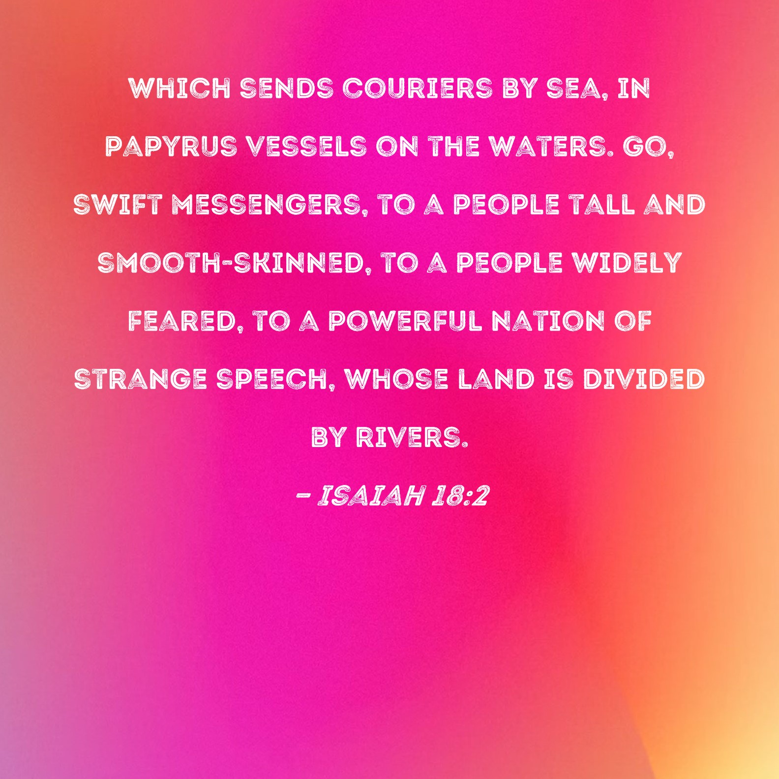 Isaiah 18:2 which sends couriers by sea, in papyrus vessels on the waters. Go, swift messengers, to a people tall and smooth-skinned, to a people widely feared, to a powerful nation of strange speech, whose land is divided by rivers.