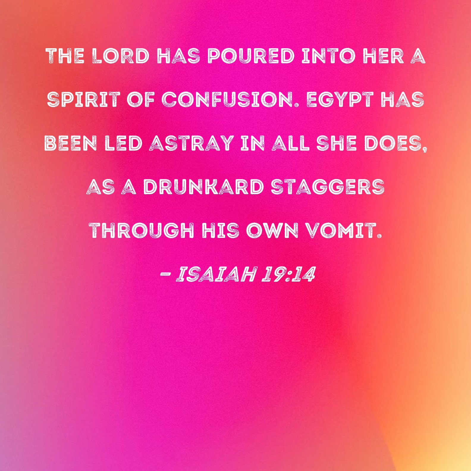 Isaiah 19:14 The LORD has poured into her a spirit of confusion. Egypt has been led astray in all she does, as a drunkard staggers through his own vomit.