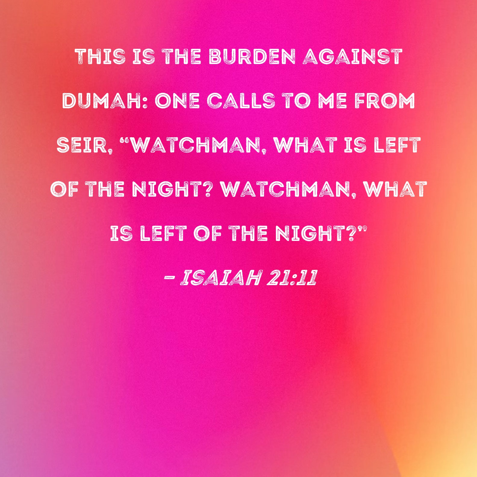 Isaiah 21:11 This is the burden against Dumah: One calls to me from Seir, "Watchman, what is left of the night? Watchman, what is left of the night?"
