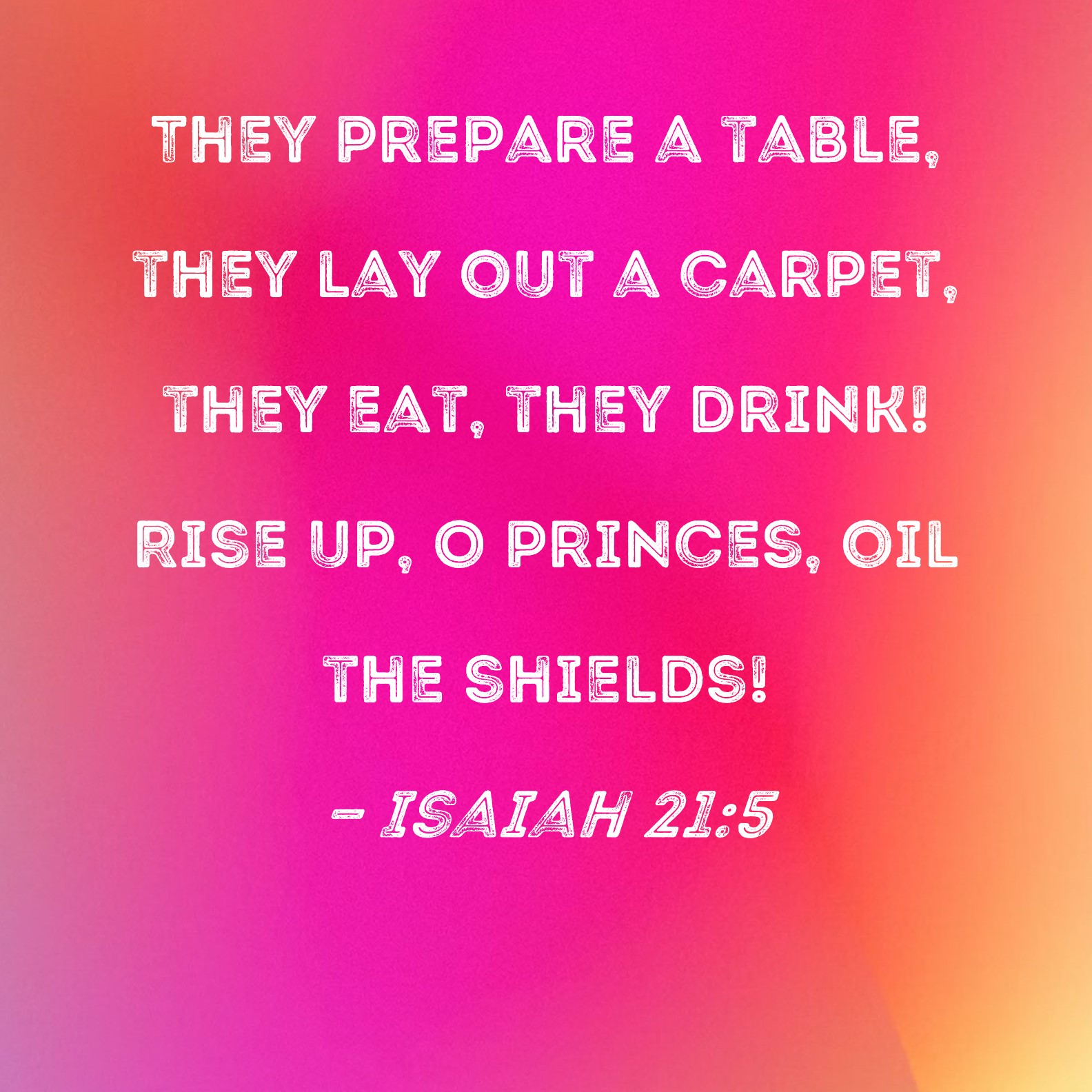 Isaiah 21:5 They prepare a table, they lay out a carpet, they eat, they drink! Rise up, O princes, oil the shields!