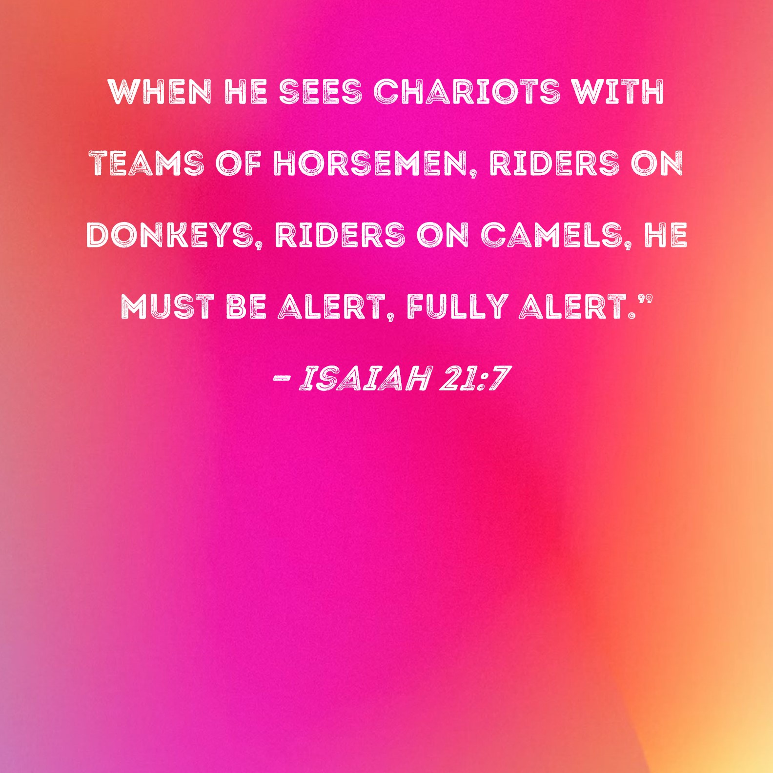 Isaiah 21:7 When he sees chariots with teams of horsemen, riders on donkeys, riders on camels, he must be alert, fully alert."