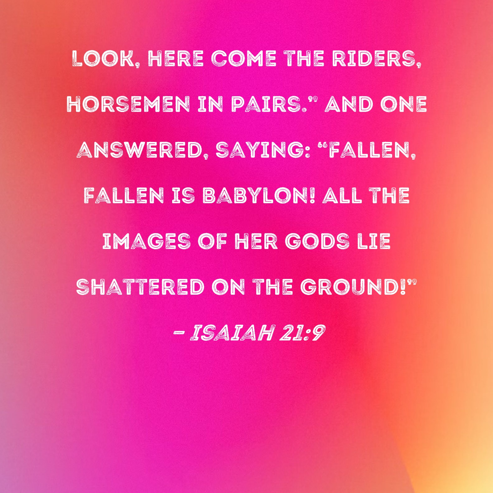 Isaiah 21:9 Look, here come the riders, horsemen in pairs." And one answered, saying: "Fallen, fallen is Babylon! All the images of her gods lie shattered on the ground!"