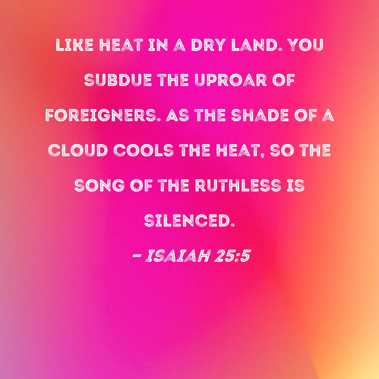 Isaiah 25:5 like heat in a dry land. You subdue the uproar of foreigners. As the shade of a cloud cools the heat, so the song of the ruthless is silenced.