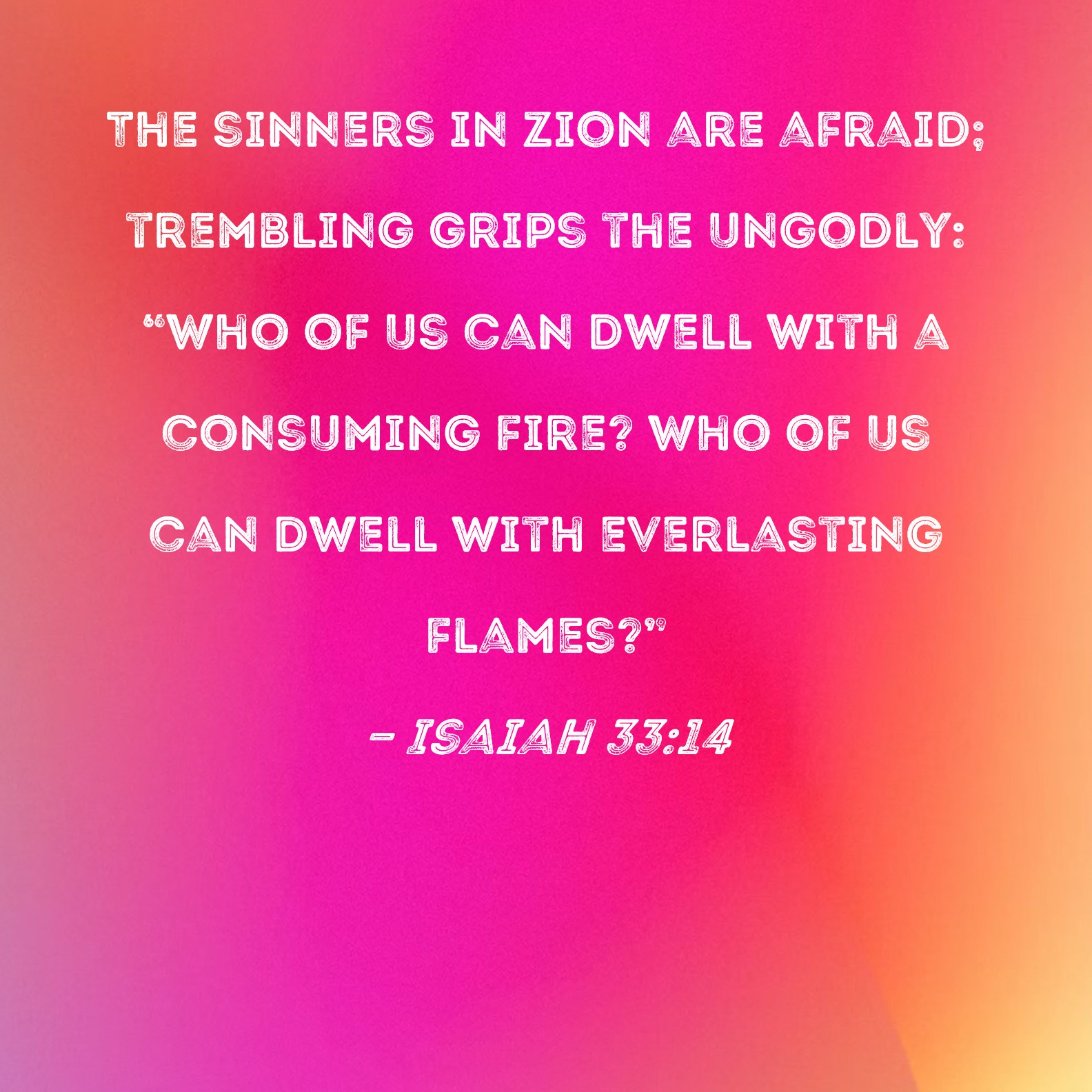 Isaiah 33:14 The sinners in Zion are afraid; trembling grips the ungodly: "Who of us can dwell with a consuming fire? Who of us can dwell with everlasting flames?"