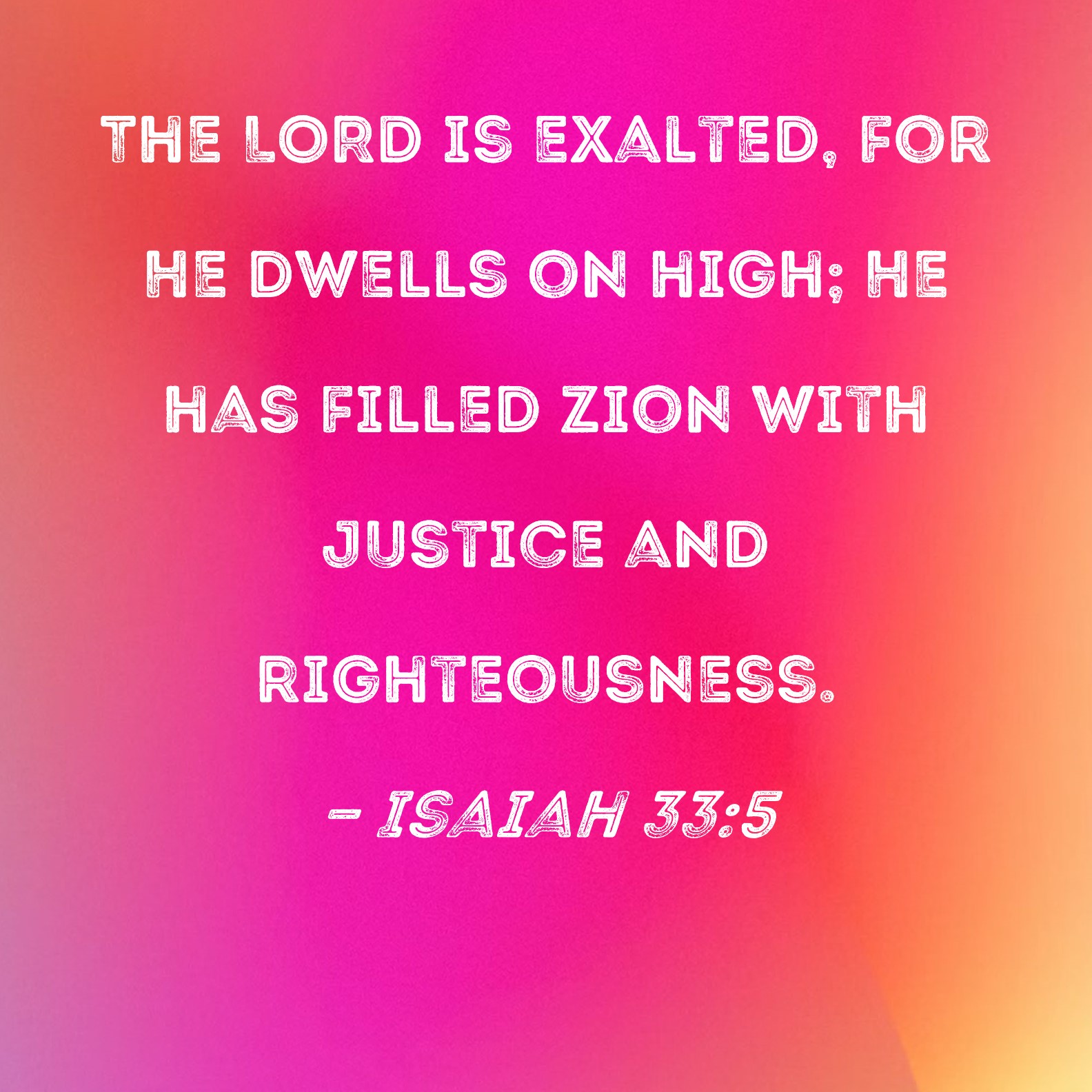Isaiah 33:5 The LORD is exalted, for He dwells on high; He has filled Zion with justice and righteousness.