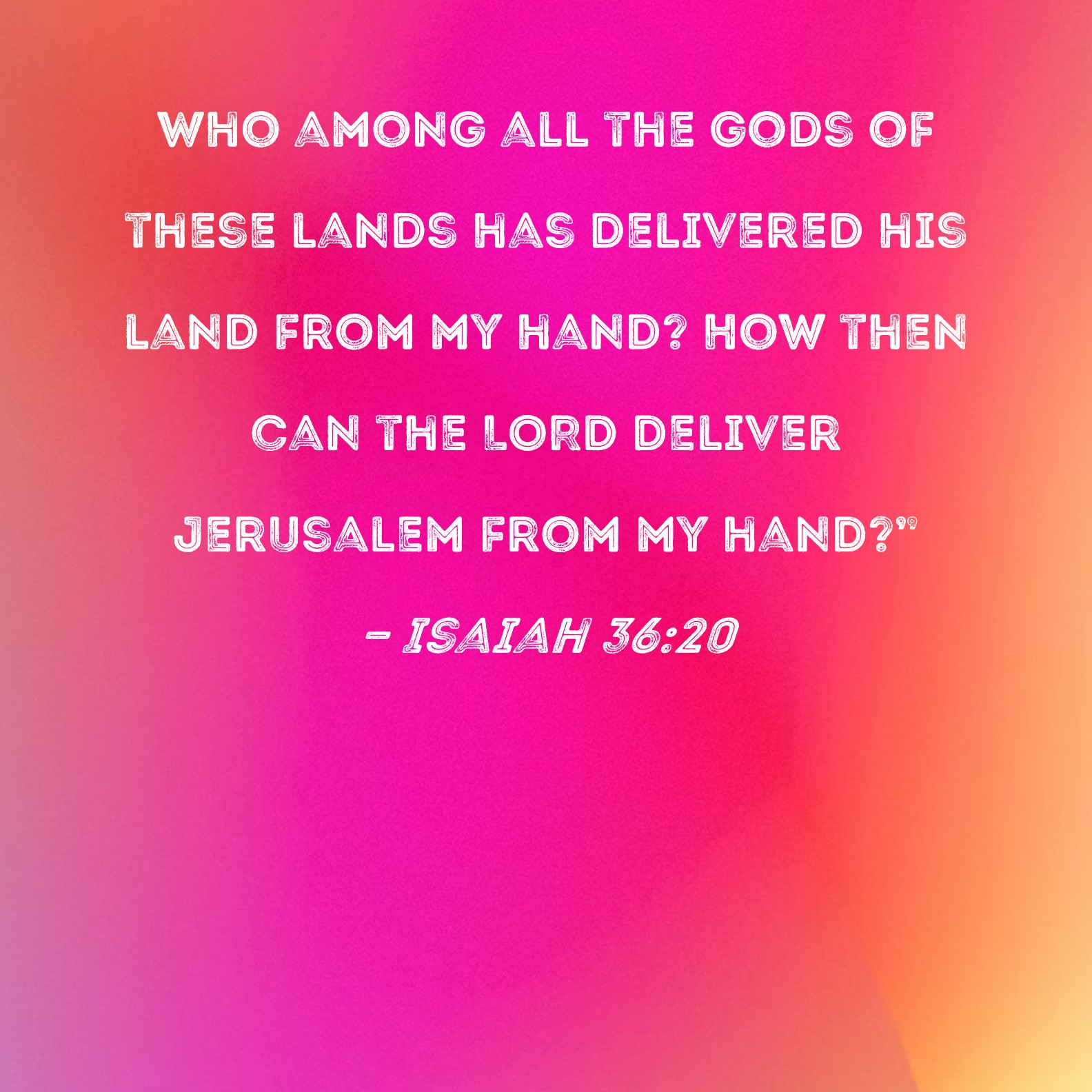 Isaiah 36:20 Who among all the gods of these lands has delivered his land from my hand? How then can the LORD deliver Jerusalem from my hand?"