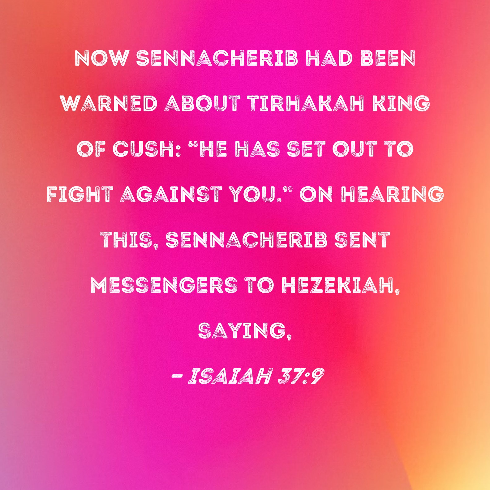 Isaiah 37:9 Now Sennacherib had been warned about Tirhakah king of Cush: "He has set out to fight against you." On hearing this, Sennacherib sent messengers to Hezekiah, saying,