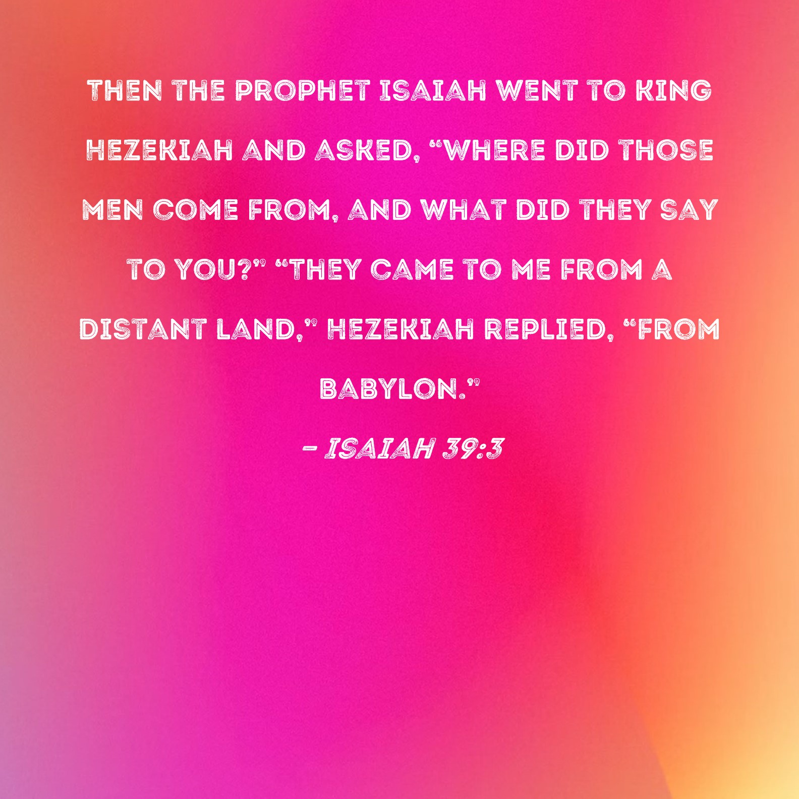 Isaiah 39:3 Then the prophet Isaiah went to King Hezekiah and asked, "Where did those men come from, and what did they say to you?" "They came to me from a distant land," Hezekiah replied, "from Babylon."