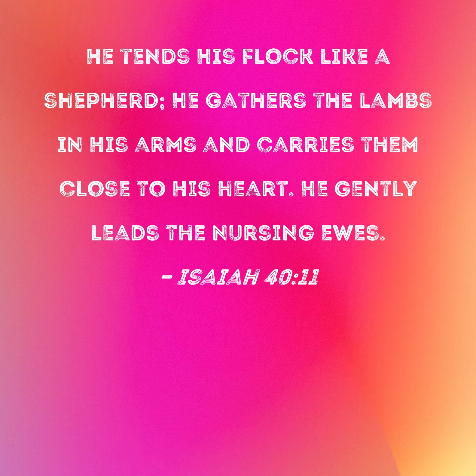 Isaiah 40:11 He tends His flock like a shepherd; He gathers the lambs in His arms and carries them close to His heart. He gently leads the nursing ewes.
