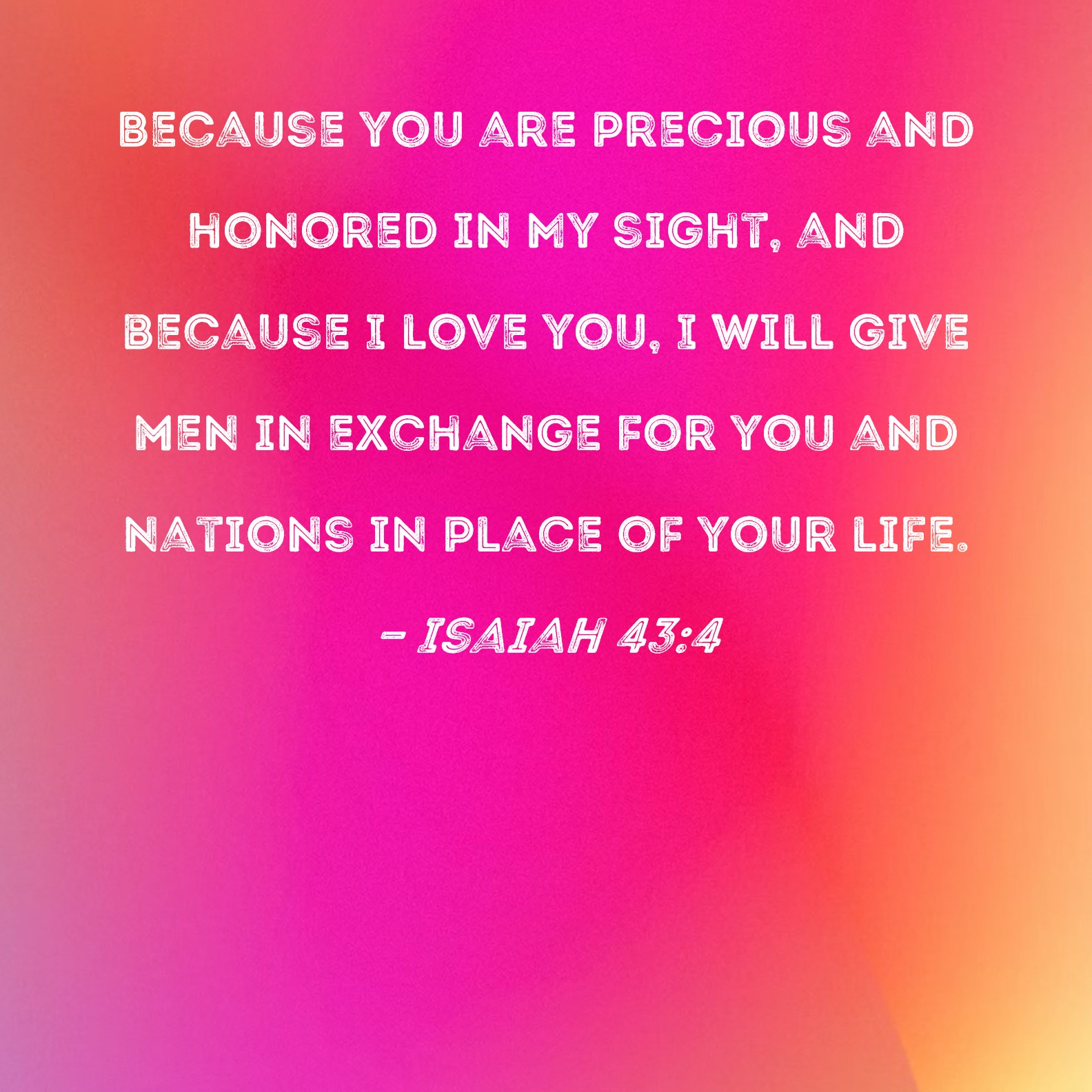 Isaiah 43:4 Because you are precious and honored in My sight, and because I love you, I will give men in exchange for you and nations in place of your life.