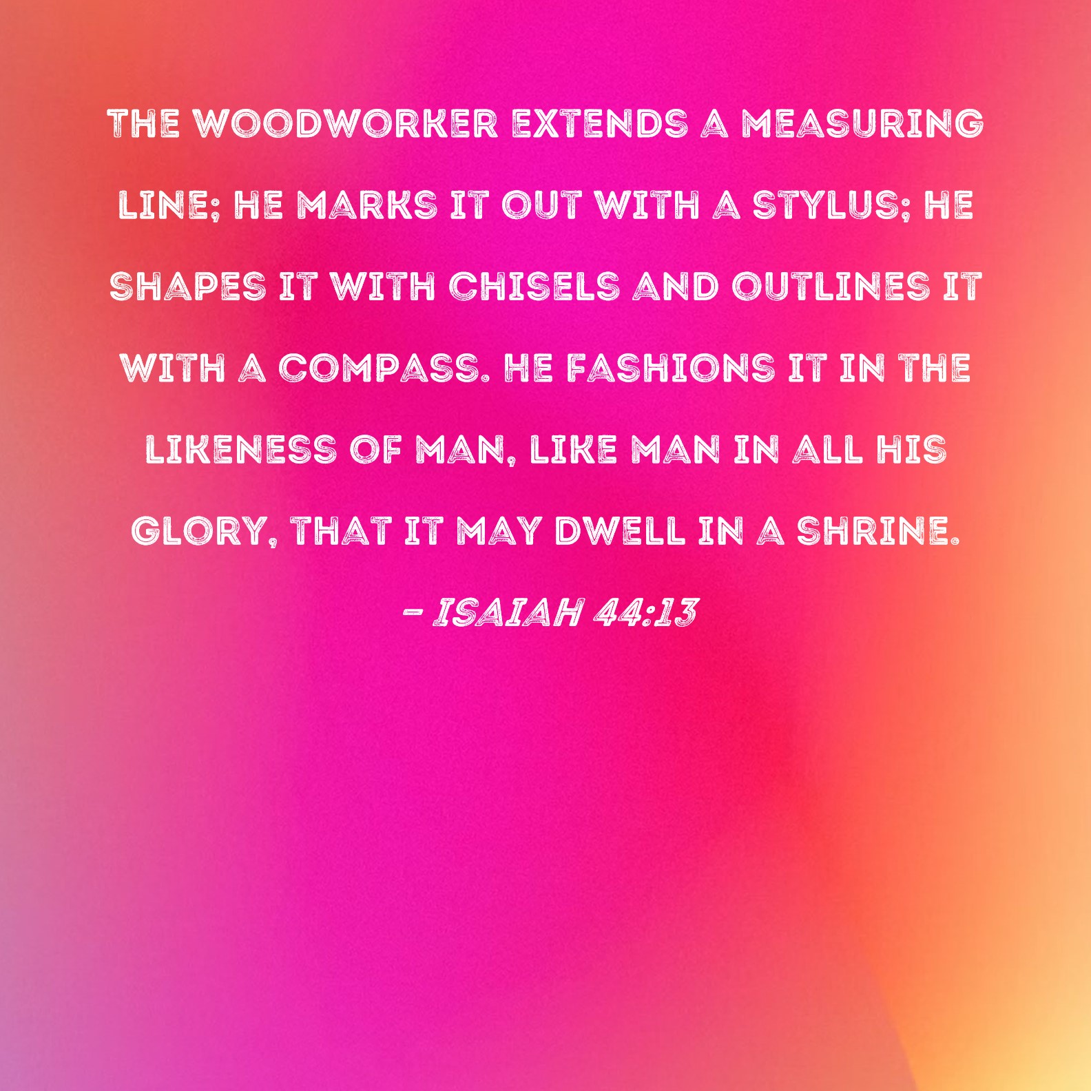 Isaiah 44:13 The woodworker extends a measuring line; he marks it out with a stylus; he shapes it with chisels and outlines it with a compass. He fashions it in the likeness of man, like man in all his glory, that it may dwell in a shrine.