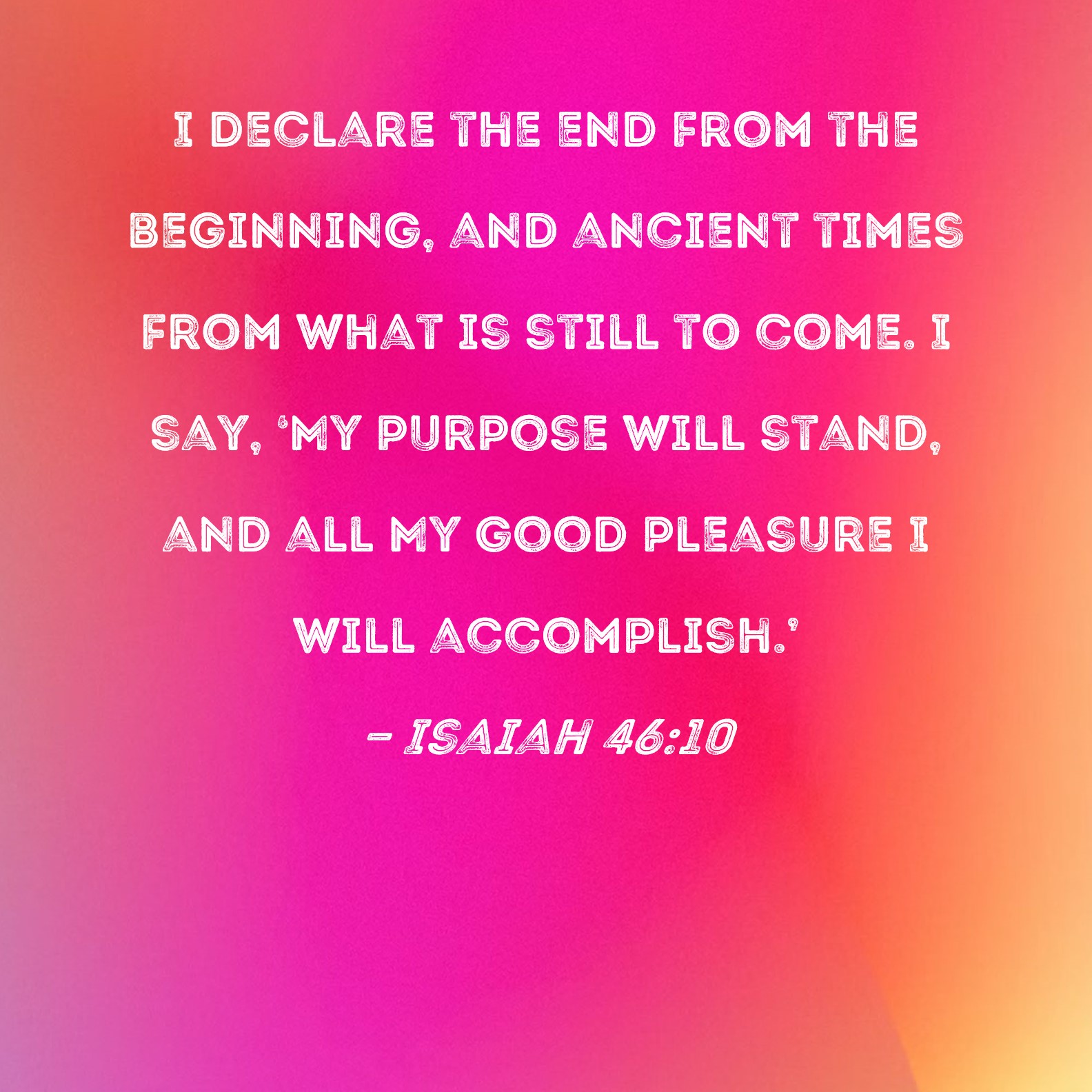 Isaiah 46:10 I declare the end from the beginning, and ancient times from what is still to come. I say, 'My purpose will stand, and all My good pleasure I will accomplish.'