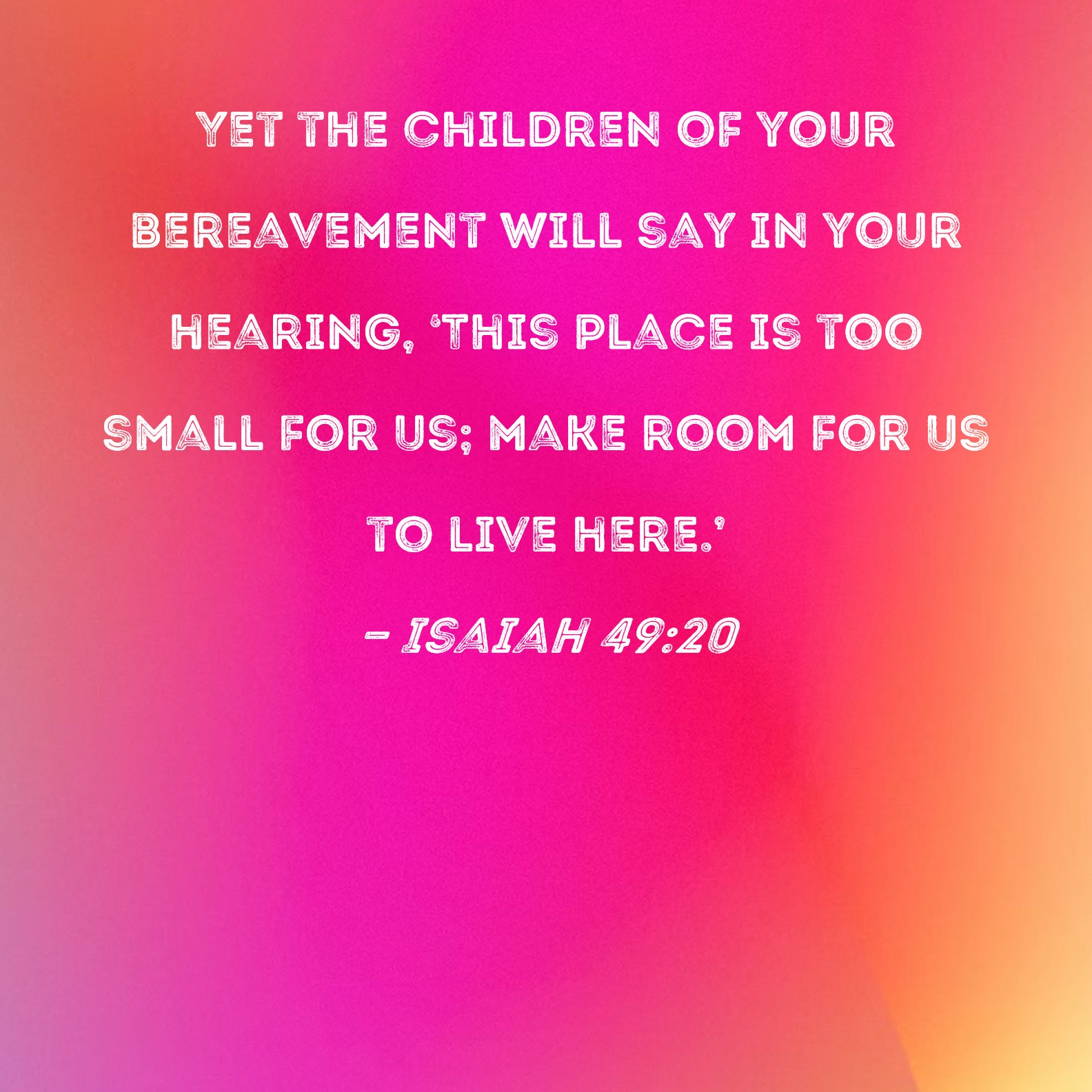 Isaiah 49:20 Yet the children of your bereavement will say in your hearing, 'This place is too small for us; make room for us to live here.'