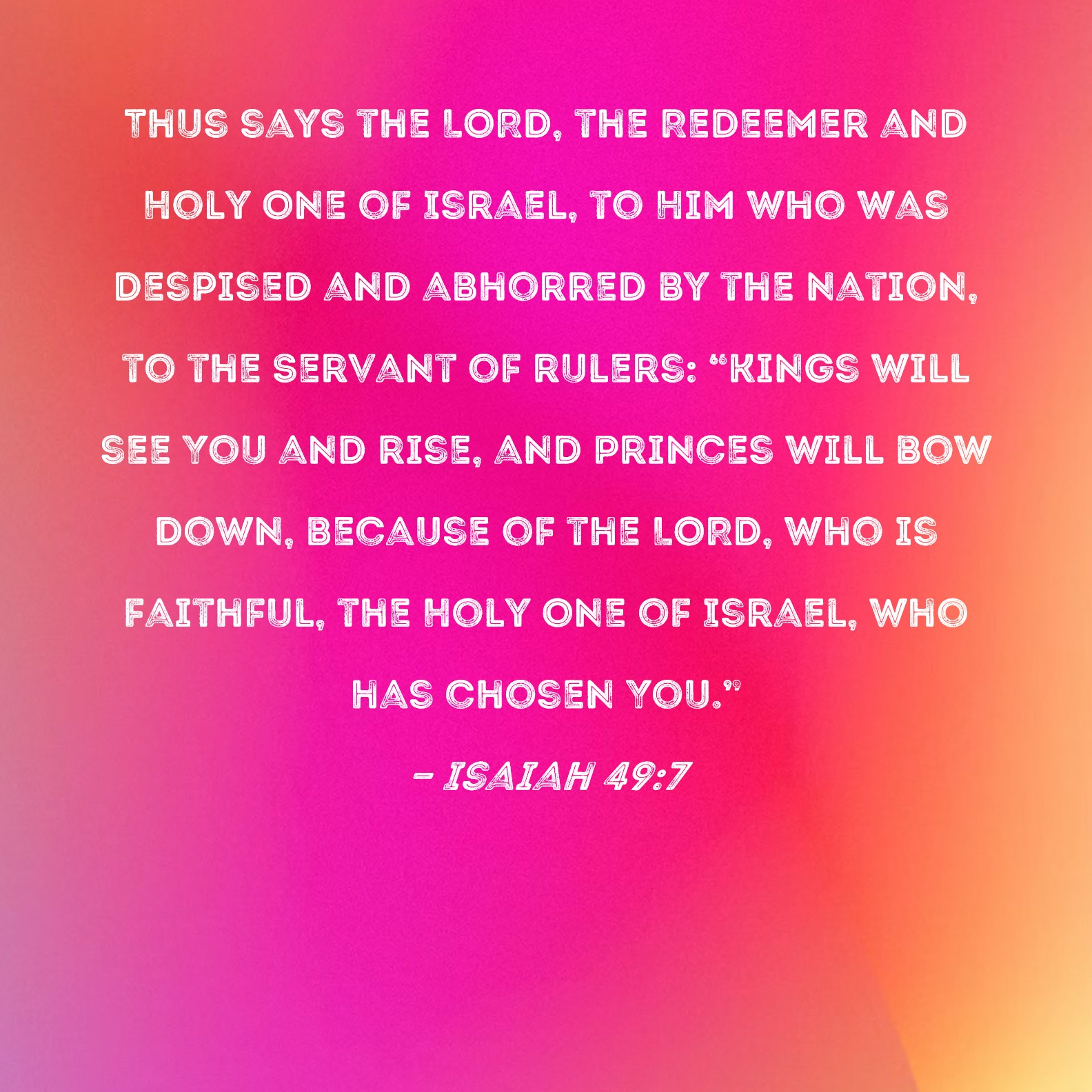 Isaiah 49:7 Thus says the LORD, the Redeemer and Holy One of Israel, to Him who was despised and abhorred by the nation, to the Servant of rulers: "Kings will see You and rise, and princes will bow down, because of the LORD, who is faithful, the Holy One of Israel, who has chosen You."