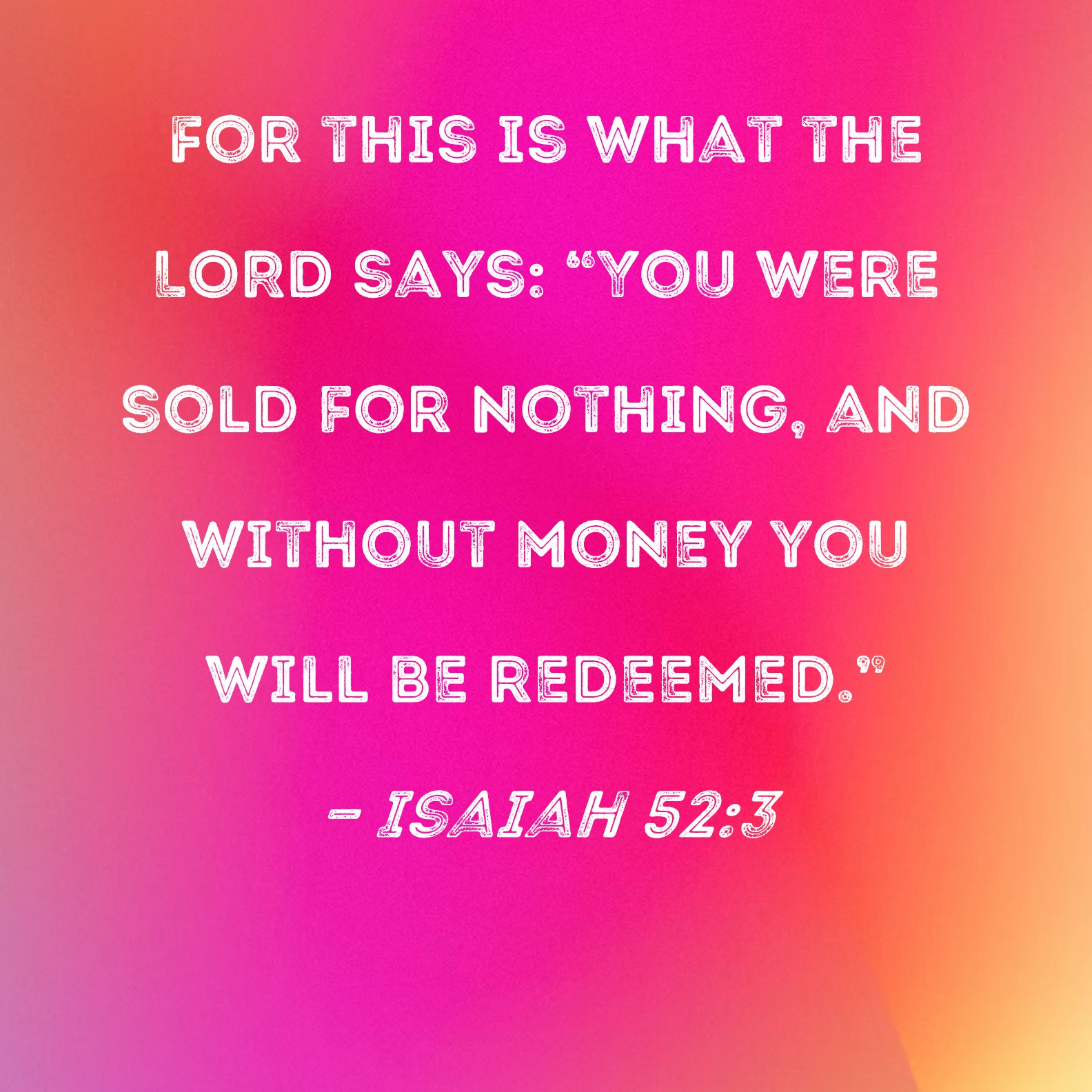 Isaiah 52:3 For this is what the LORD says: "You were sold for nothing, and without money you will be redeemed."