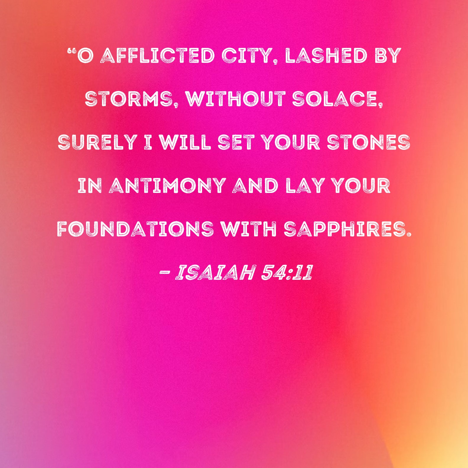 Isaiah 54:11 "O afflicted city, lashed by storms, without solace, surely I will set your stones in antimony and lay your foundations with sapphires.