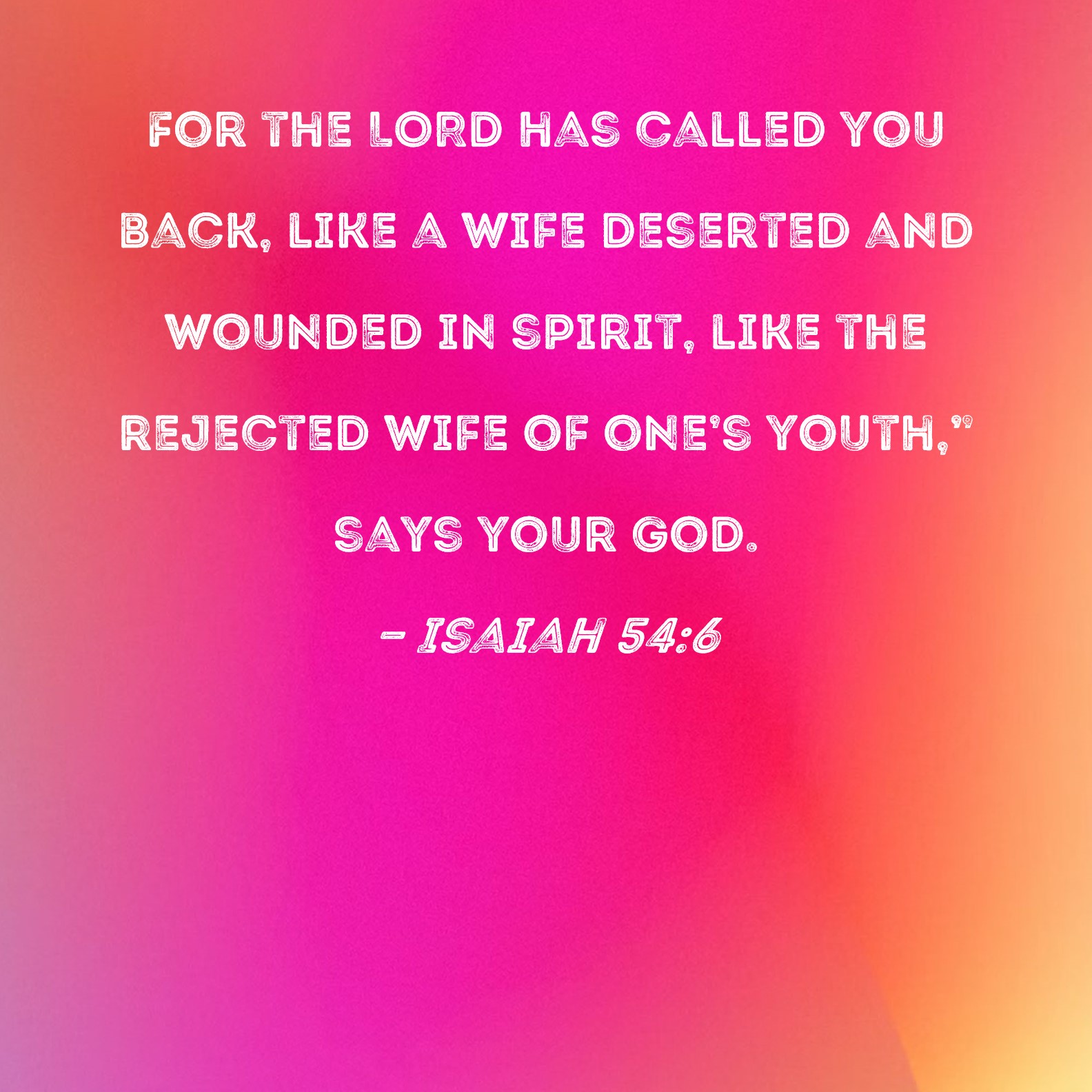 Isaiah 54:6 For the LORD has called you back, like a wife deserted and wounded in spirit, like the rejected wife of one's youth," says your God.