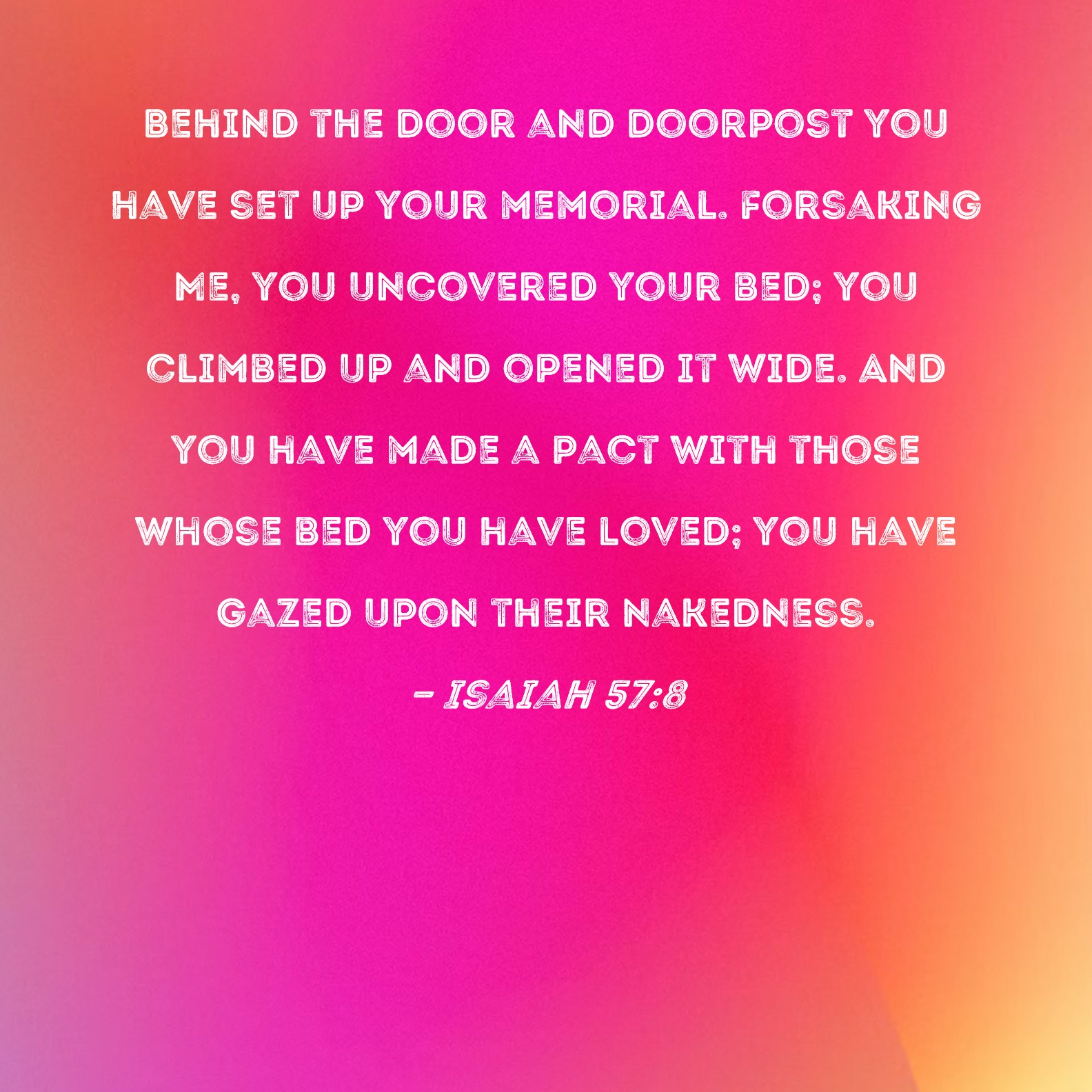 Isaiah 57:8 Behind the door and doorpost you have set up your memorial. Forsaking Me, you uncovered your bed; you climbed up and opened it wide. And you have made a pact with those whose bed you have loved; you have gazed upon their nakedness.